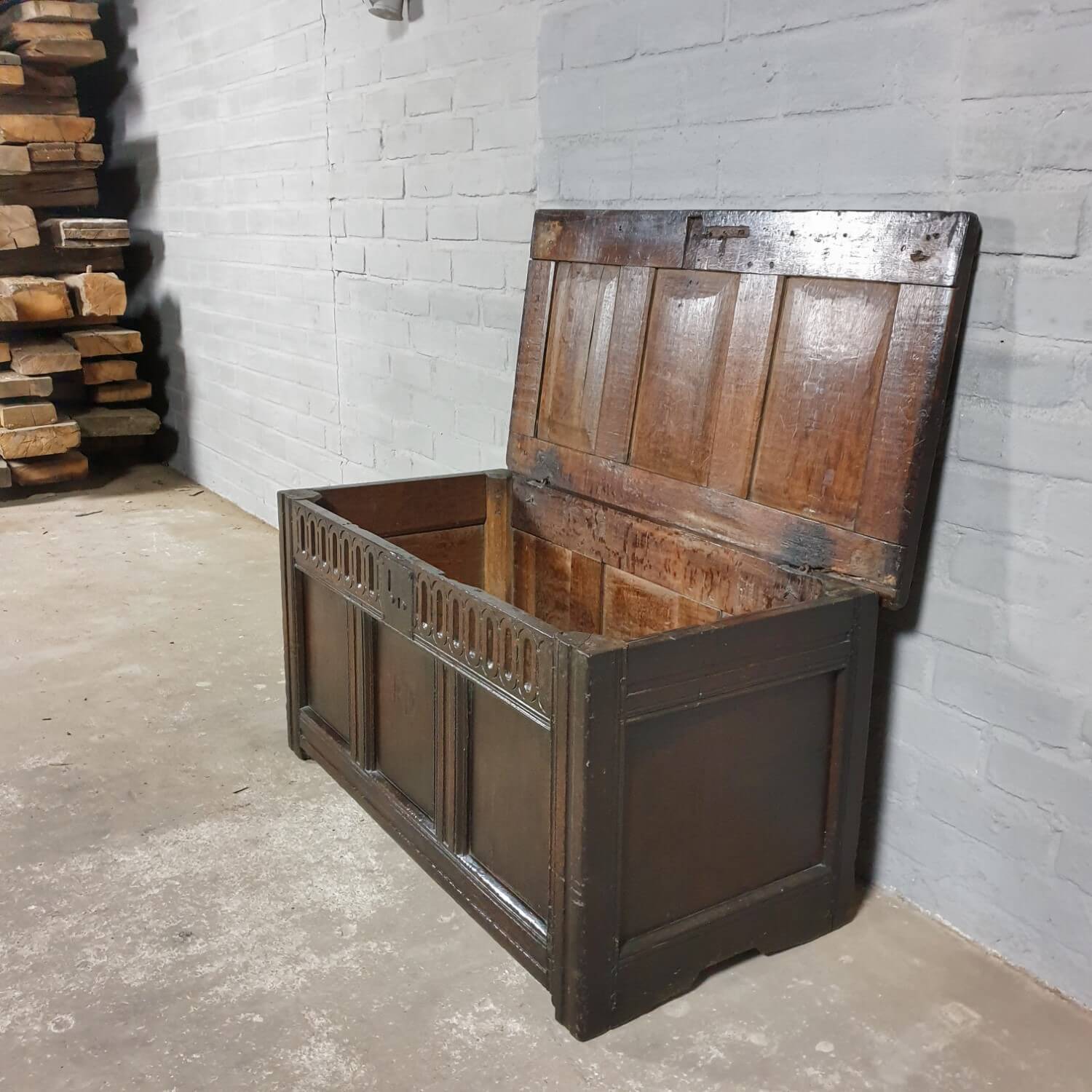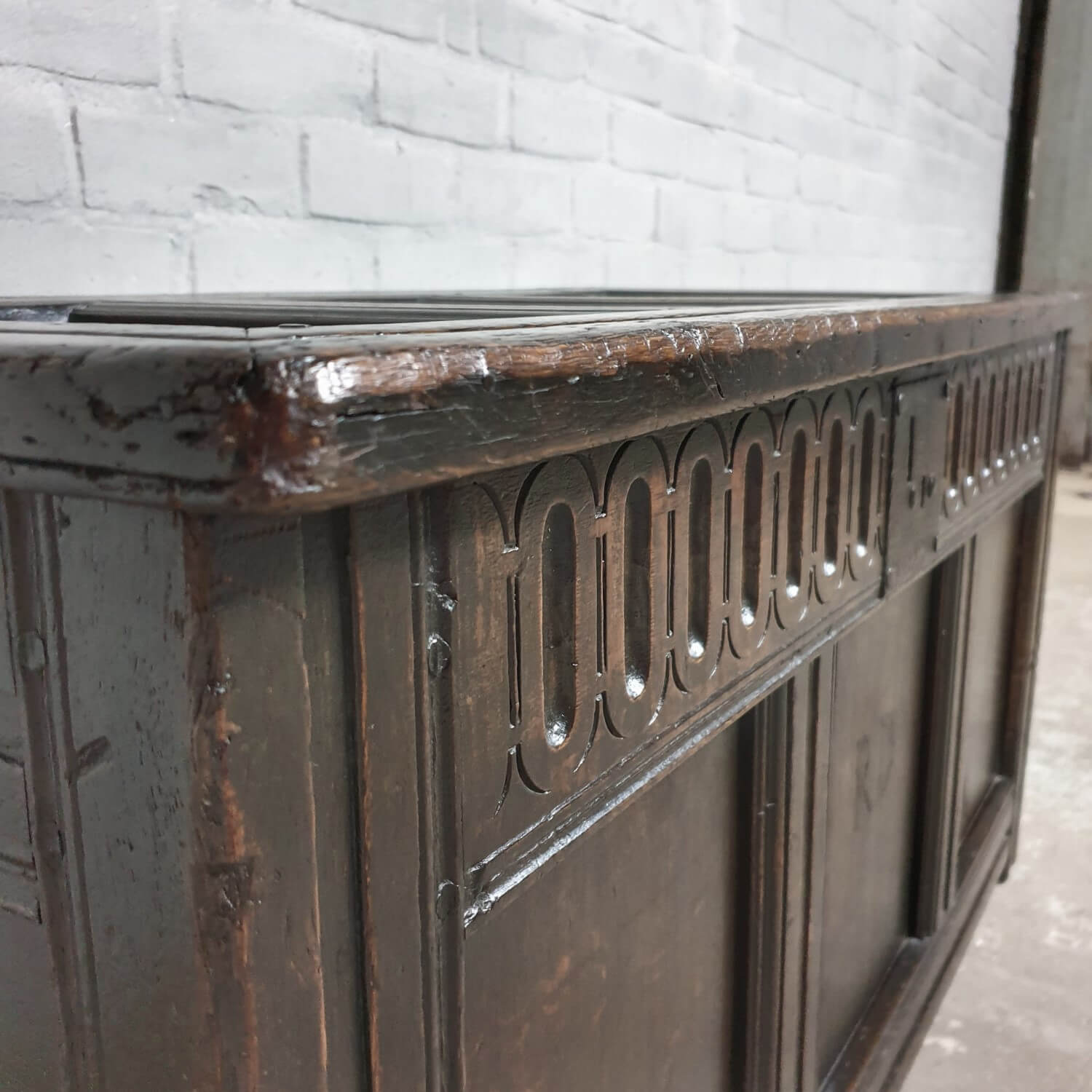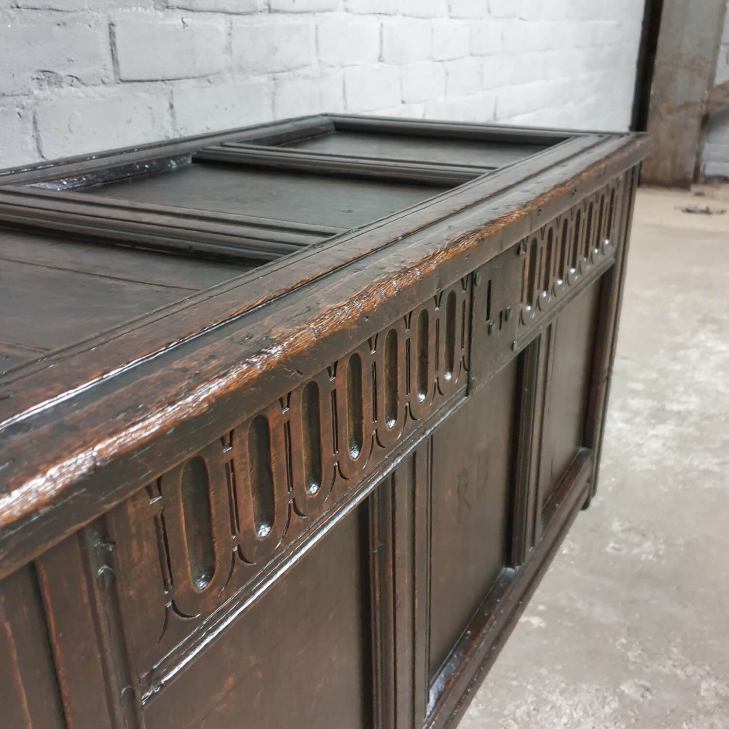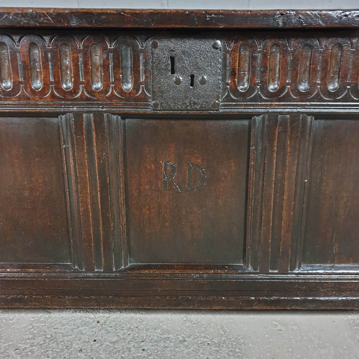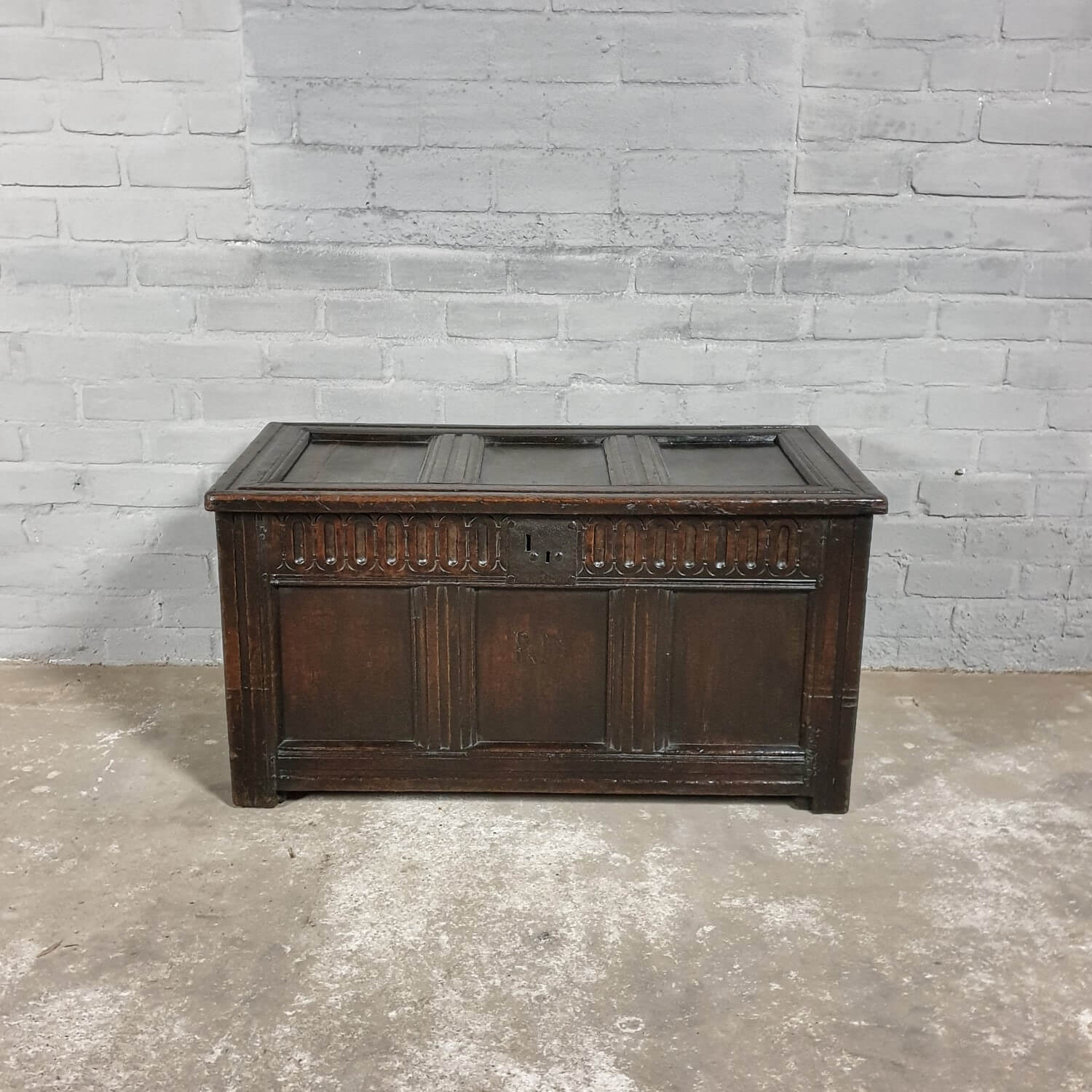Deze antieke Engelse kist is uit de eind 17e eeuw tijdens de periode van Charles II. De kist heeft aan de zij- en bovenkanten panelen en is aan alle kanten versiert met fraai geometrisch snijwerk. Hiernaast zijn de initialen ‘RD’ in de voorkant gegrafeerd.