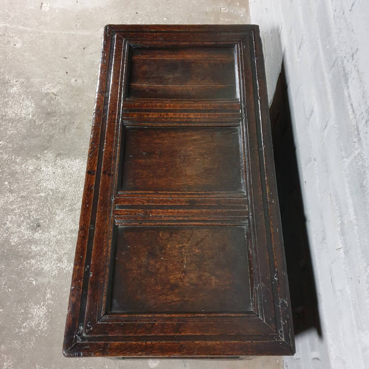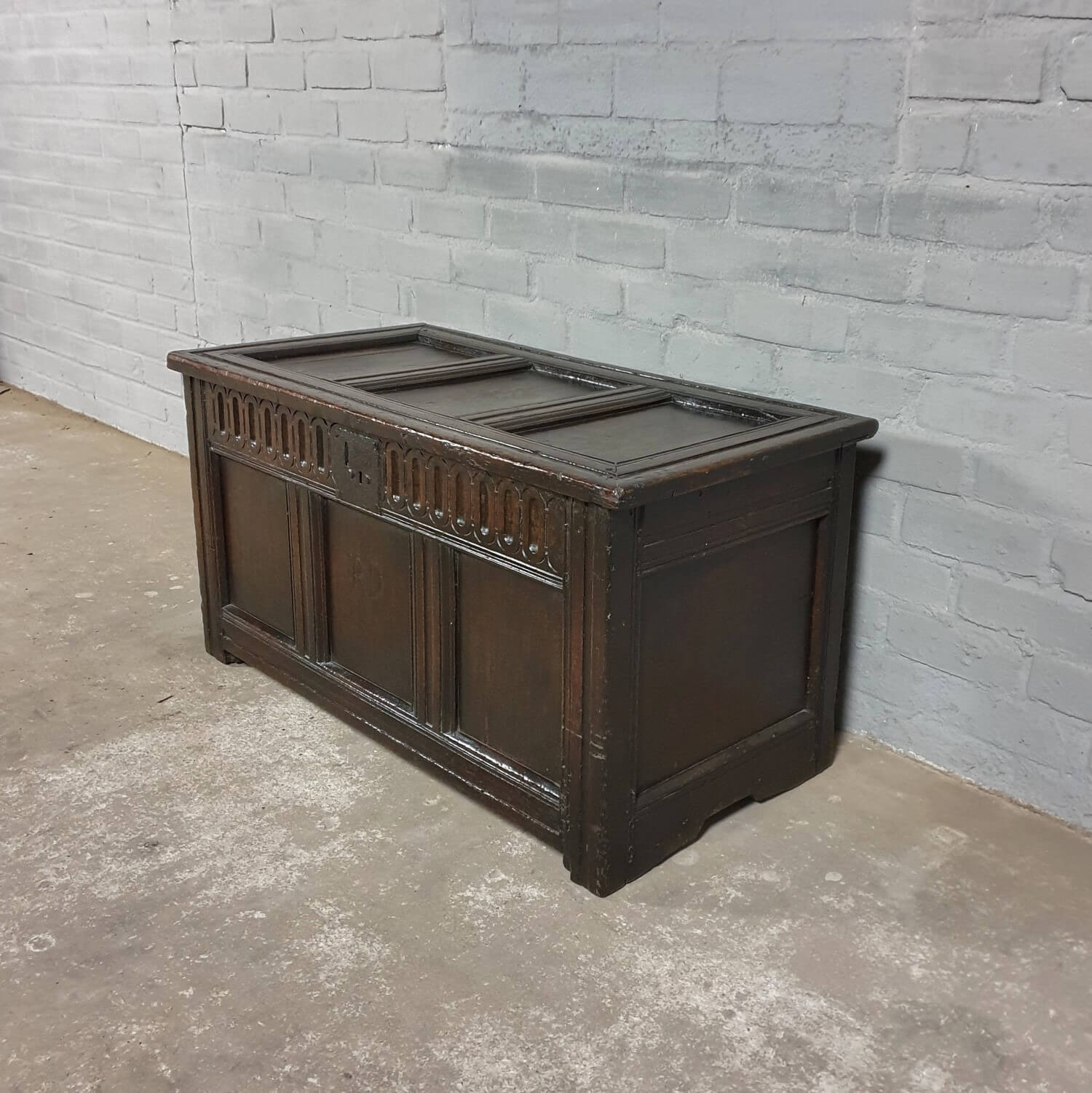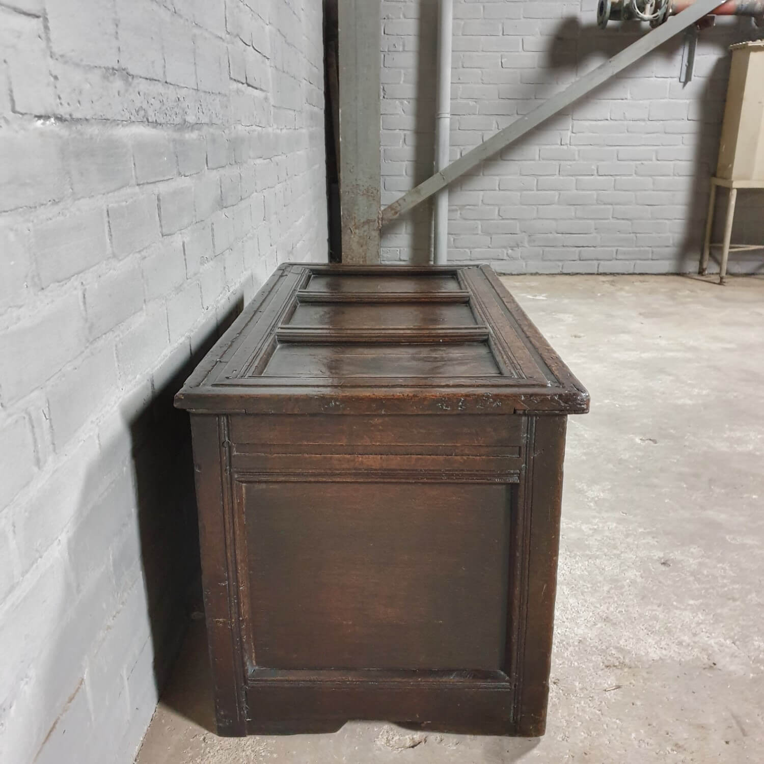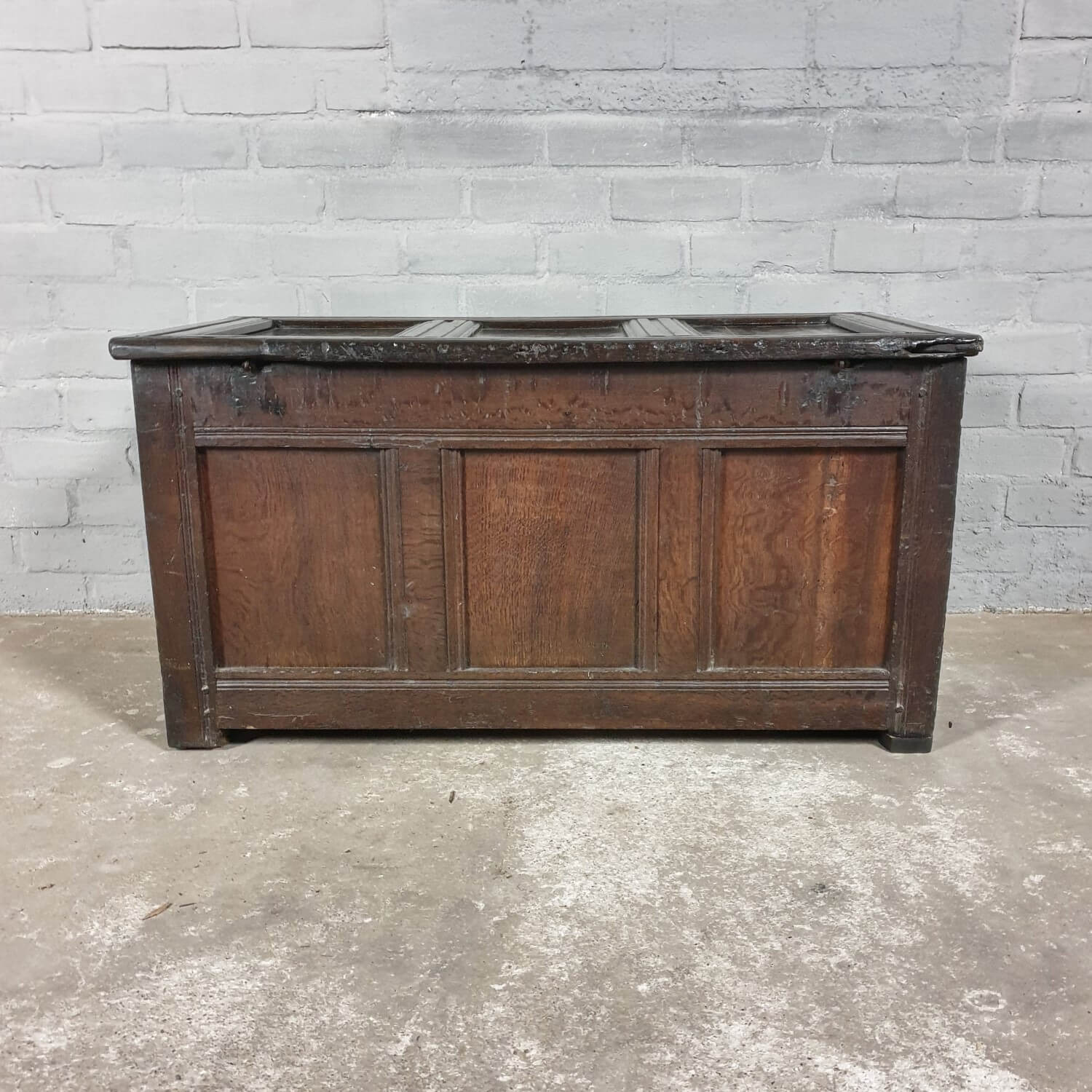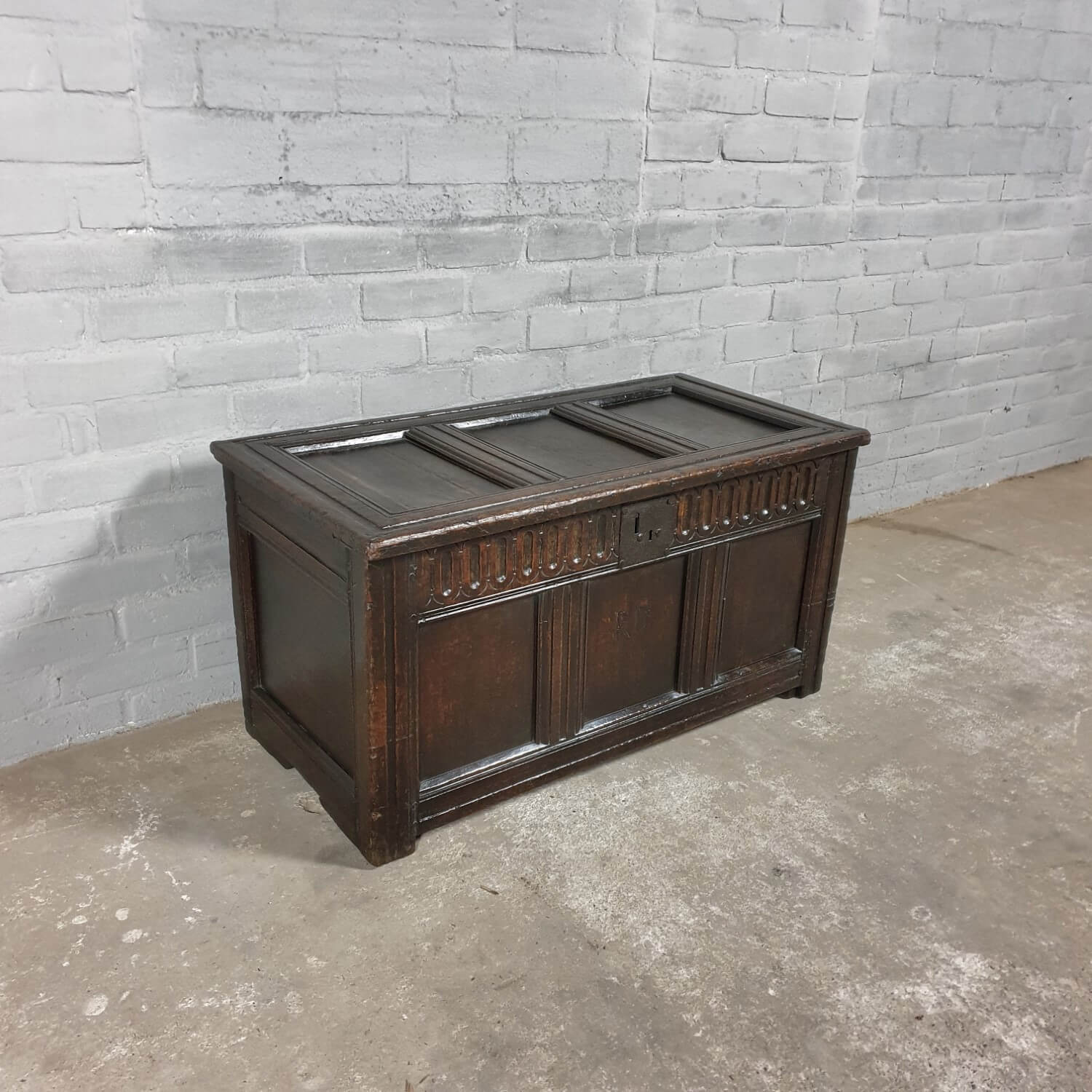 Deze antieke Engelse kist is uit de eind 17e eeuw tijdens de periode van Charles II. De kist heeft aan de zij- en bovenkanten panelen en is aan alle kanten versiert met fraai geometrisch snijwerk. Hiernaast zijn de initialen ‘RD’ in de voorkant gegrafeerd.