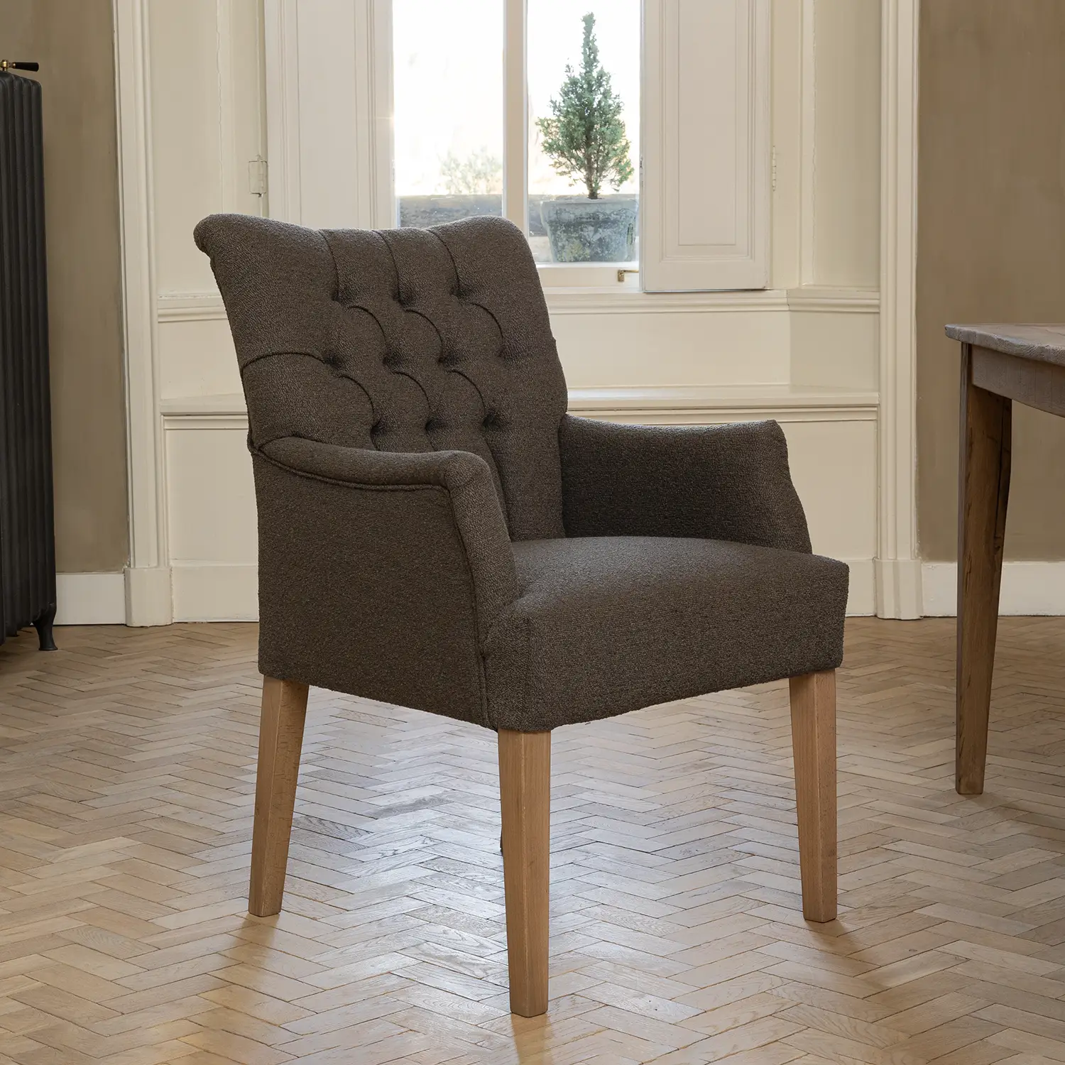 De rugleuning is in een ruitpatroon afgewerkt met echte capitons (handgetrokken knopen), wat de stoel zijn karakteristieke luxe uitstraling geeft. Daarnaast zijn de armleuningen voor het zitgemak in een stijlvolle curve naar buiten gebogen. Zo is Bruce de ideale stoel voor lange avonden aan de eettafel.