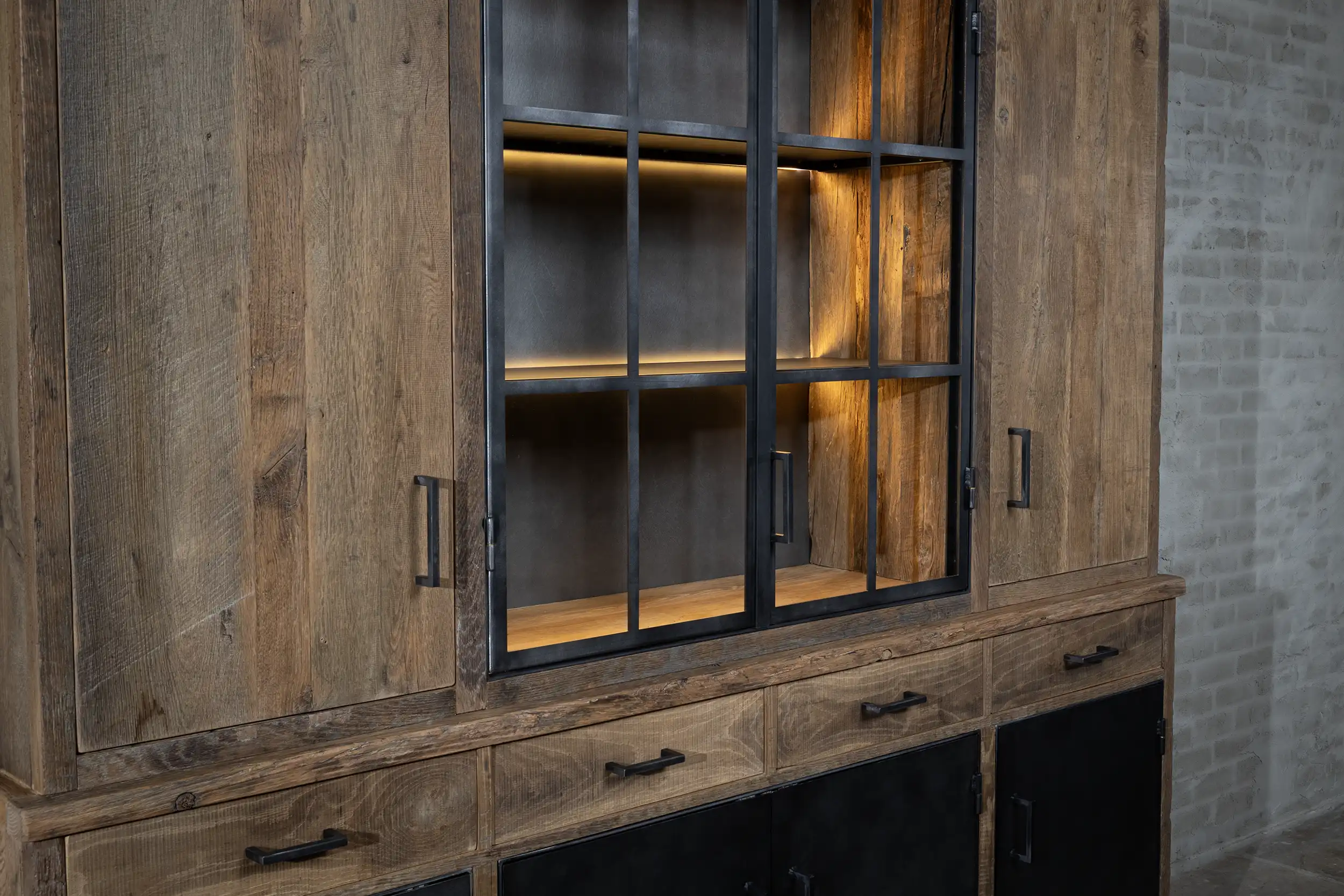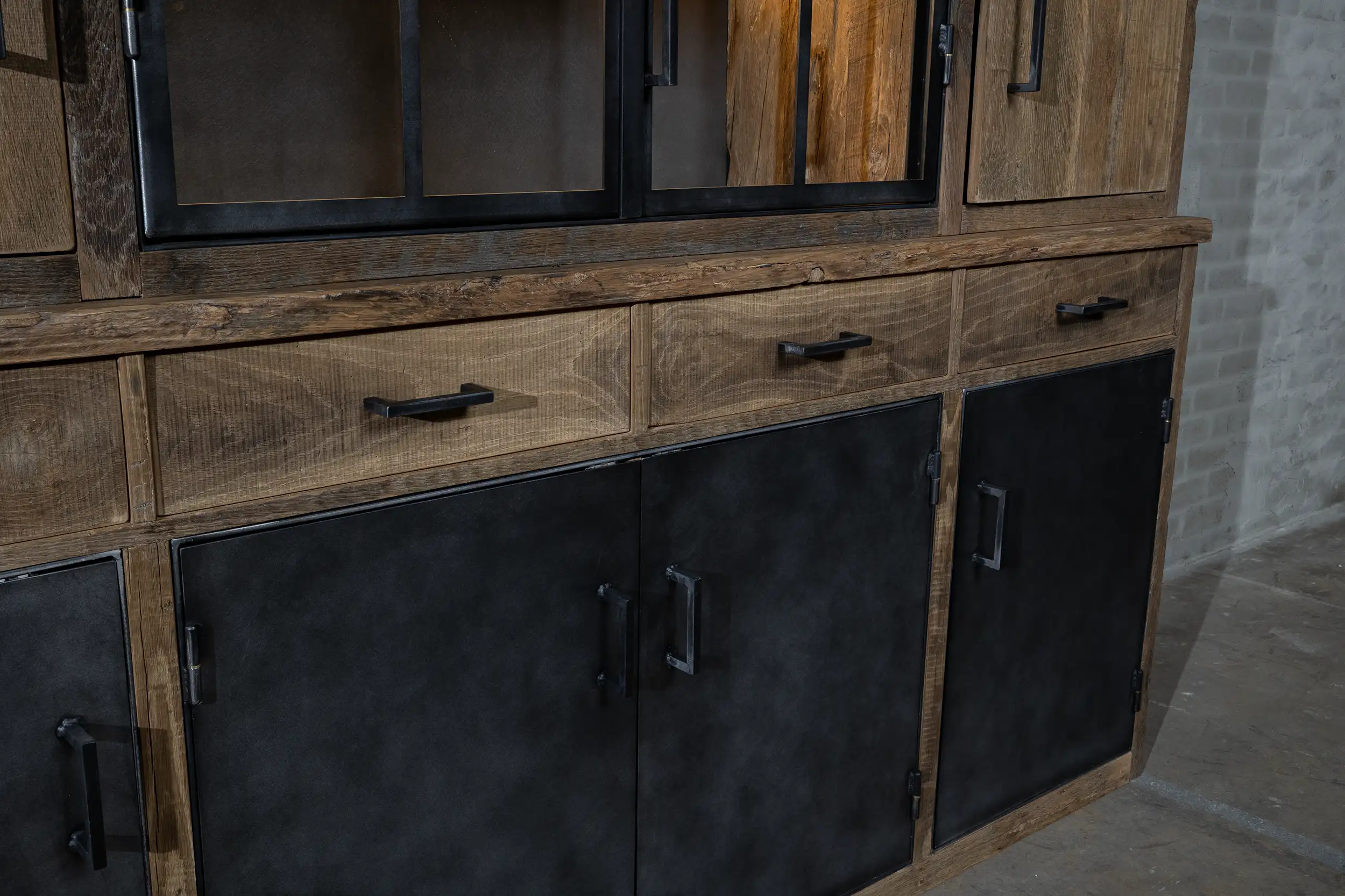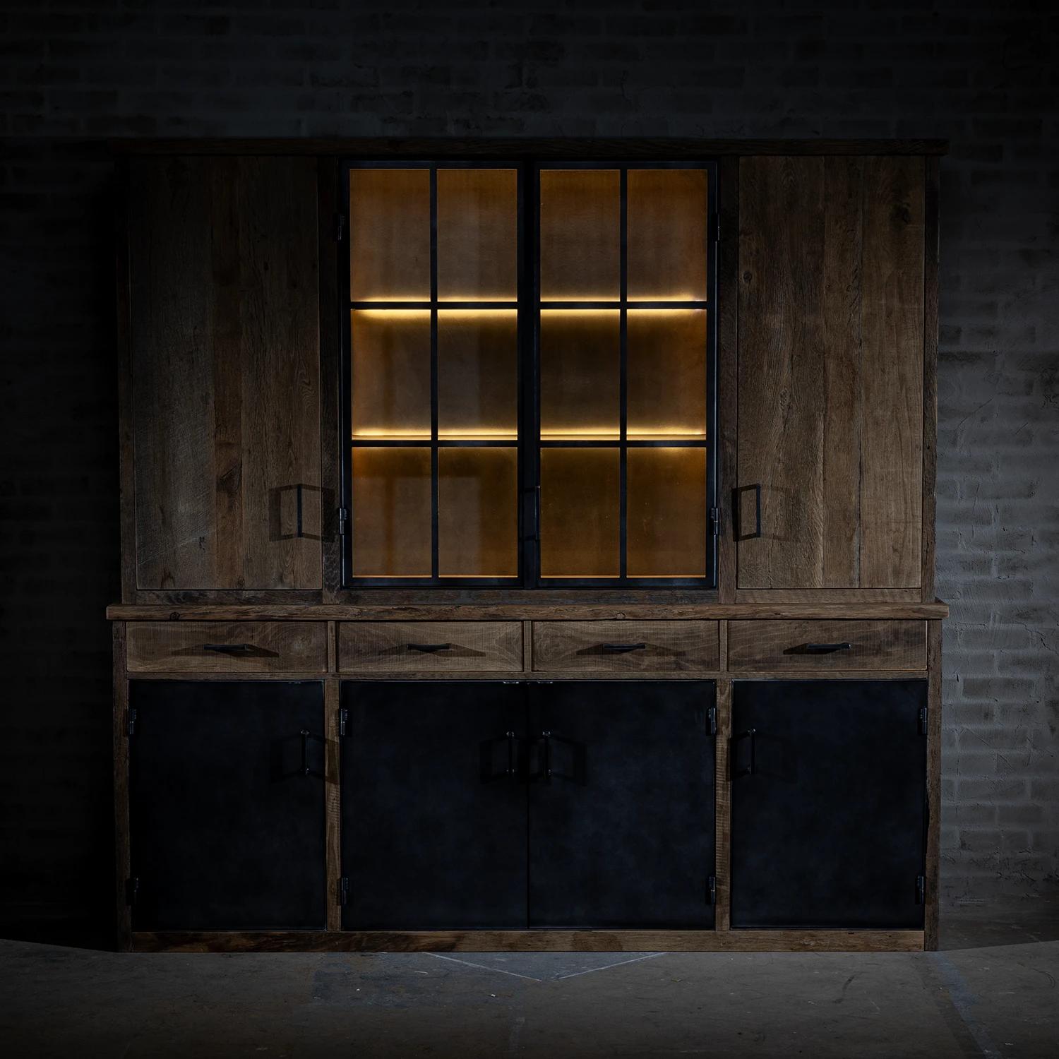 Deze landelijke buffetkast is gemaakt van hergebruikt oud eikenhout, meubelplaat, industrieel plaatstaal en ijzeren beslag. Dit model is ontworpen voor extra veel opbergruimte, zowel in de onderkast als in de bovenkast. Zo is de onderkast voorzien van klapdeuren, en lades met soft-close mechanisme. Daarnaast is de bovenkast opgemaakt uit een vitrine-element in het midden en twee eiken klapdeuren aan de buitenkanten.
