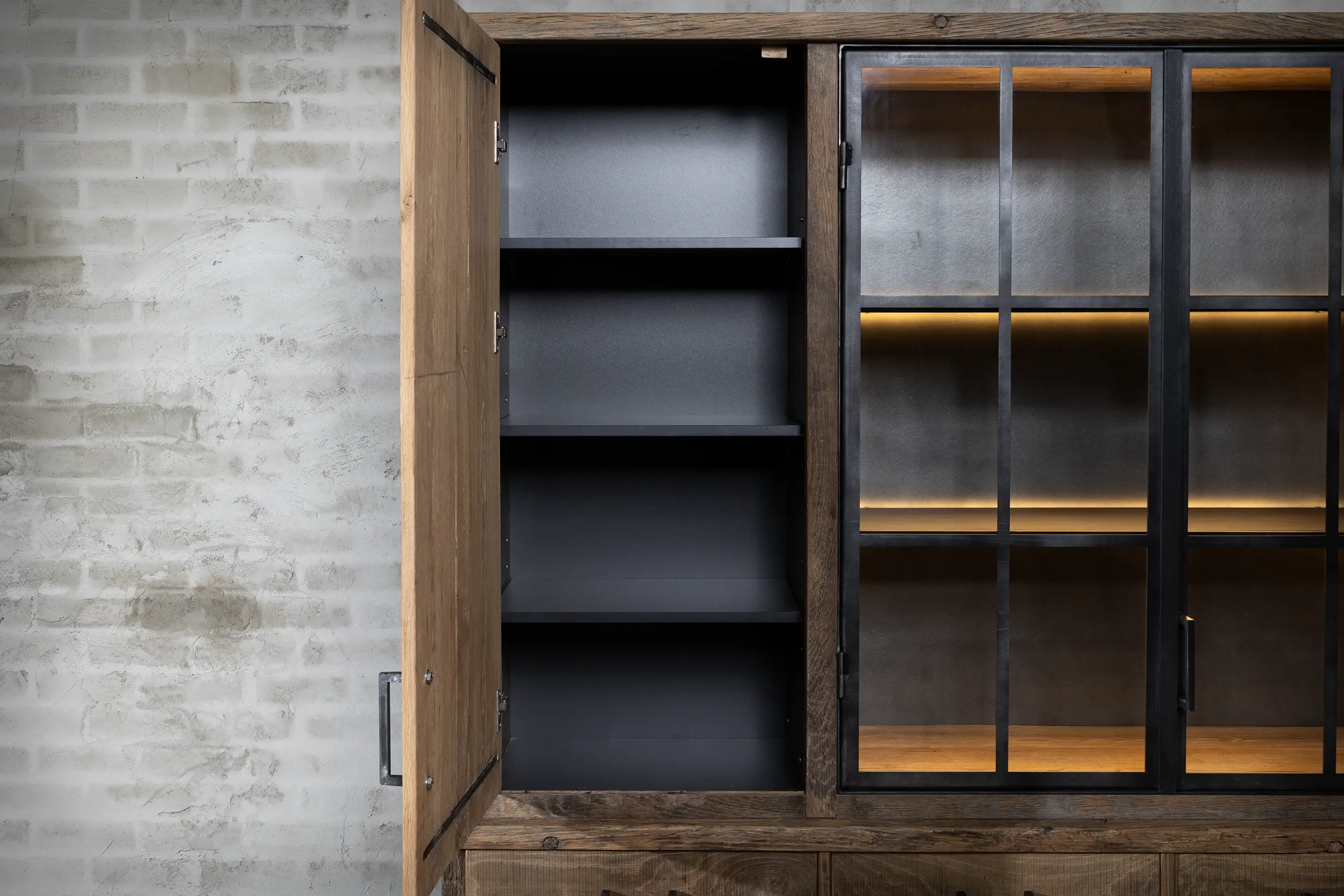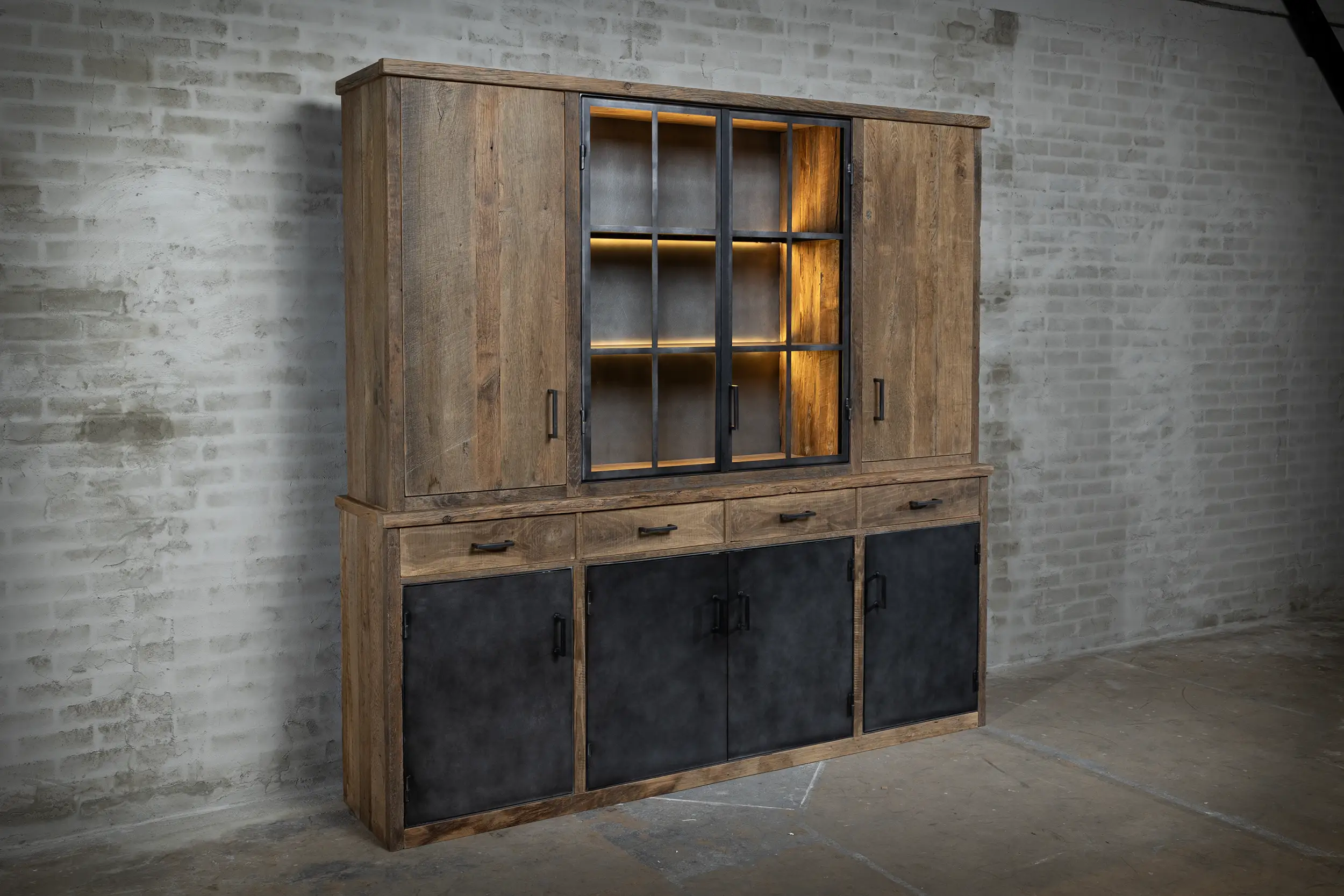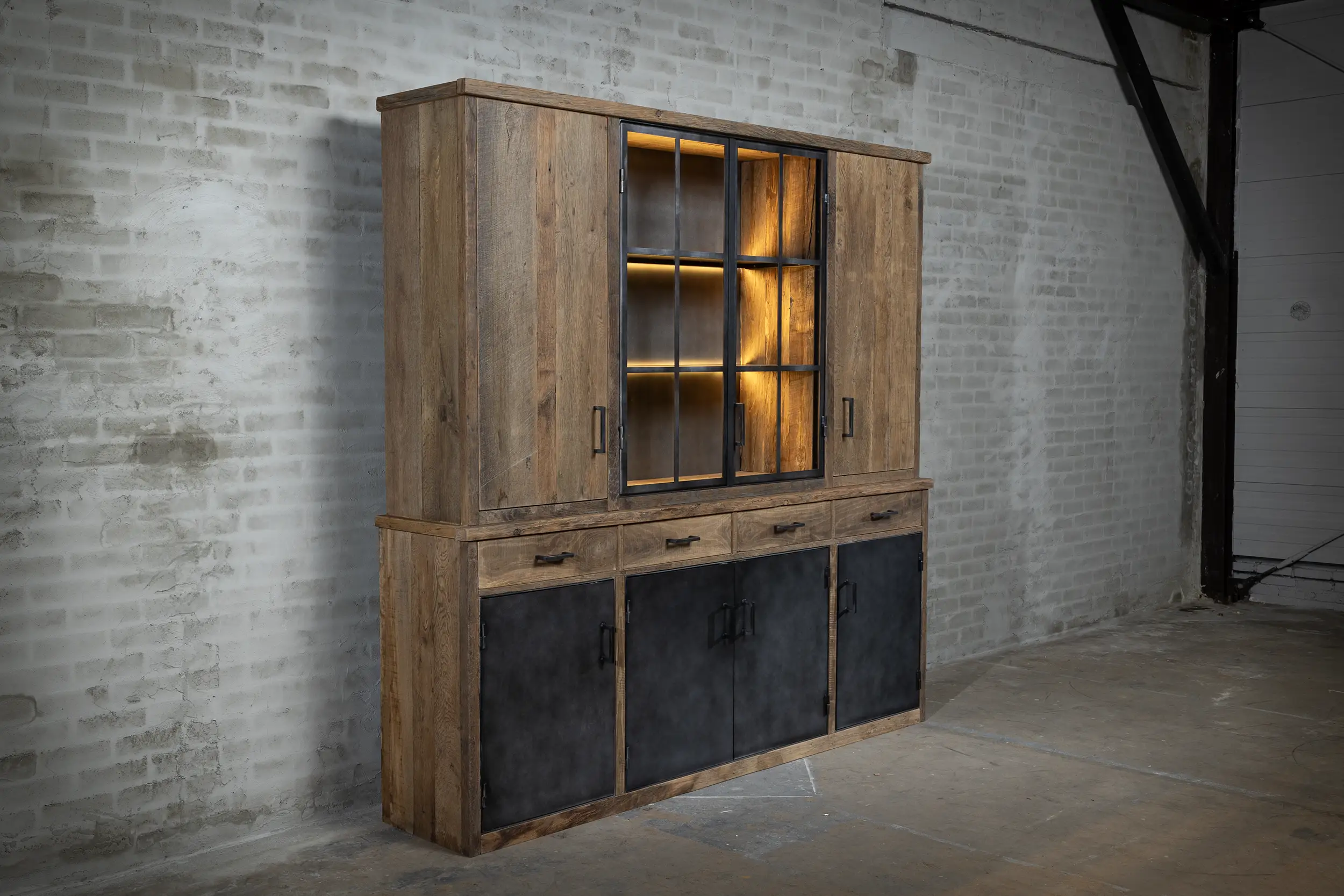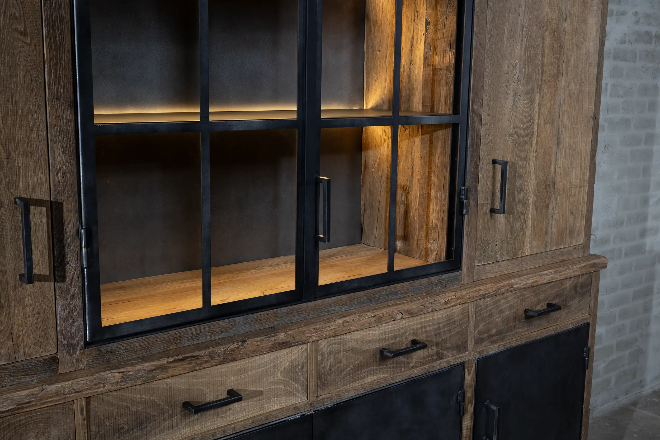 Deze landelijke buffetkast is gemaakt van hergebruikt oud eikenhout, meubelplaat, industrieel plaatstaal en ijzeren beslag. Dit model is ontworpen voor extra veel opbergruimte, zowel in de onderkast als in de bovenkast. Zo is de onderkast voorzien van klapdeuren, en lades met soft-close mechanisme. Daarnaast is de bovenkast opgemaakt uit een vitrine-element in het midden en twee eiken klapdeuren aan de buitenkanten.