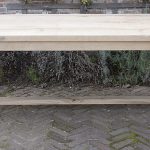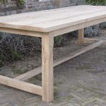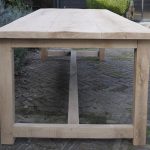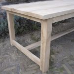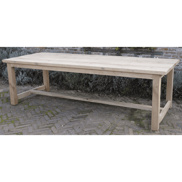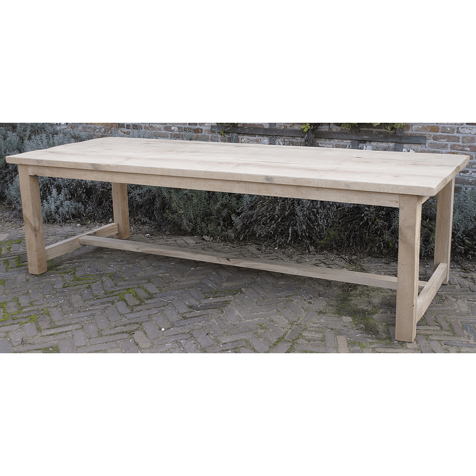 Deze kloostertafel met blokpoten is door onszelf ontworpen en in eigen werkplaats gemaakt. Het tafelblad is gemaakt van ca. 4cm dik eikenhout. Het model van deze tafel is geïnspireerd door de lange eettafels die in Europese kloosters geregeld voorkwamen. Dit is te zien aan de dwarsbalken tussen de poten en het robuuste tafelblad, die kenmerkend zijn voor antieke kloostertafels.