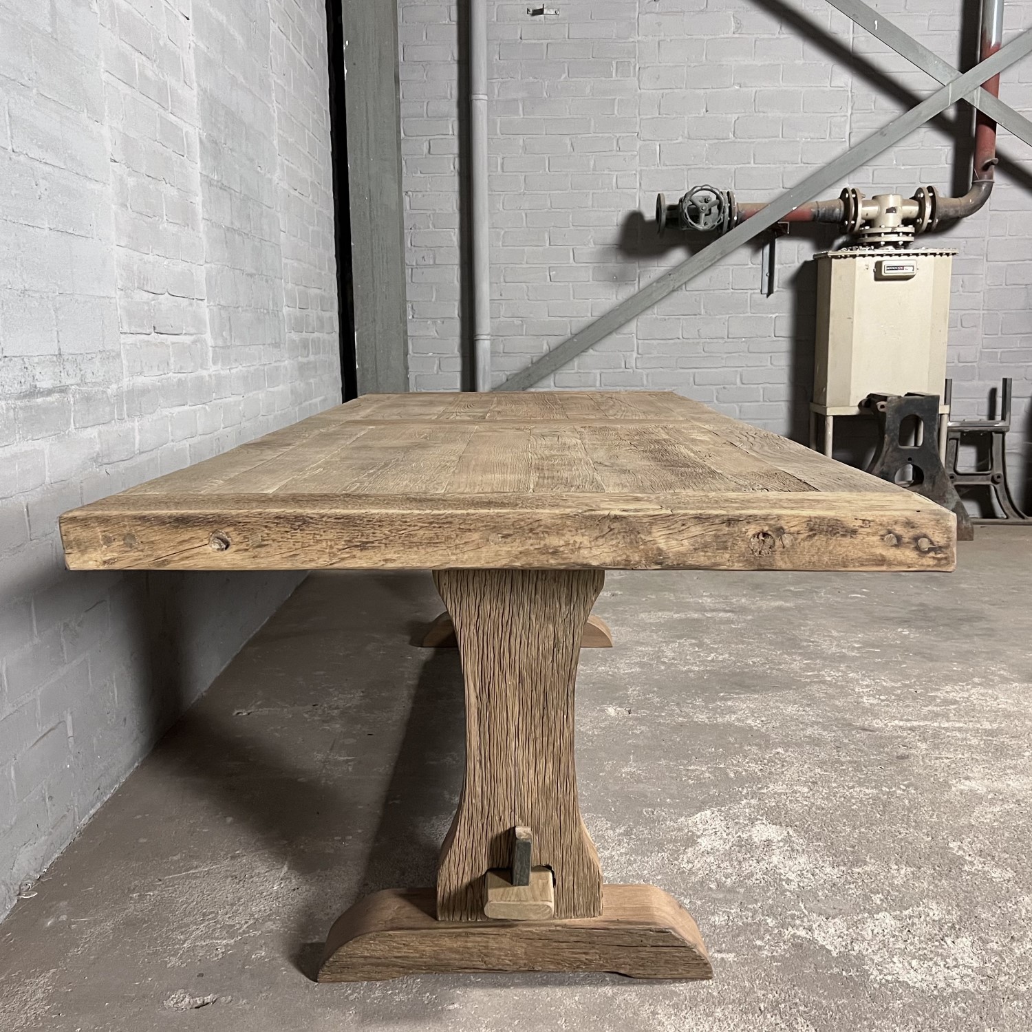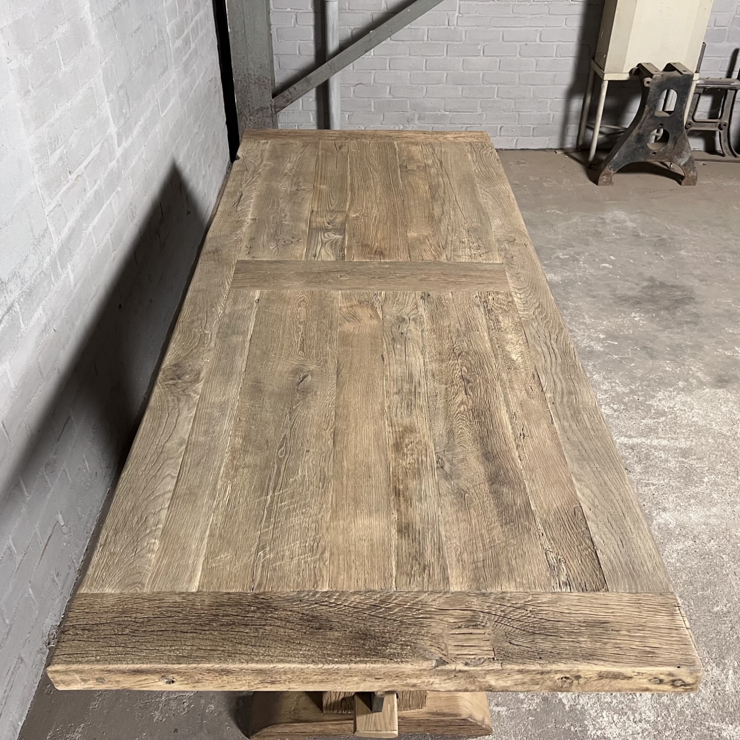 Het tafelblad van ca. 7cm dik wordt gemaakt van dun zonverbrand oud eiken (gezaagd uit de buitenkant van oude balken) dat is belijmd op meubelbeplating. De buitenste randen zijn gemaakt van massieve planken. Doordat het eikenhout jaren lang als gevelbekleding in de zon verkleurd is, heeft het een prachtige natuurlijke patina gekregen.