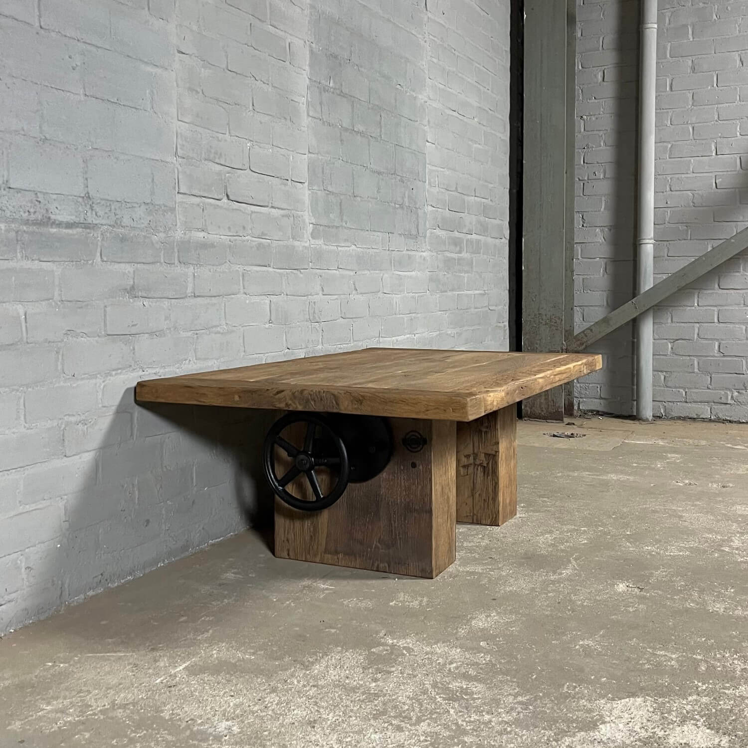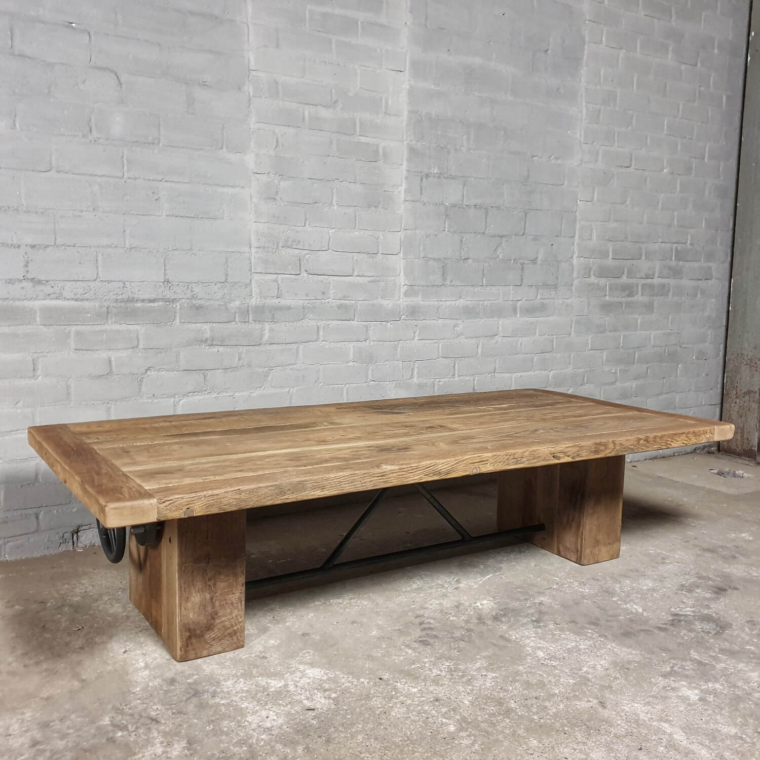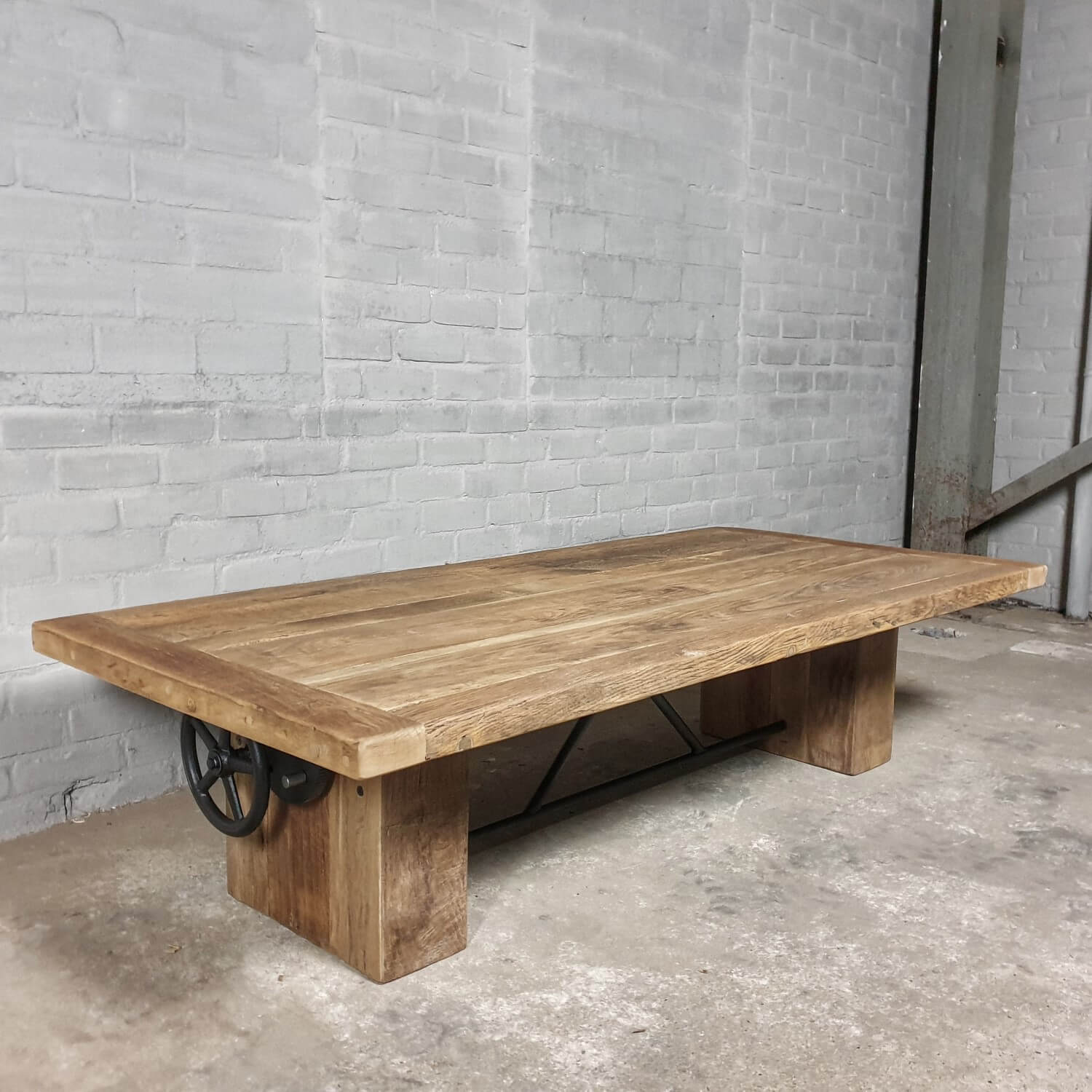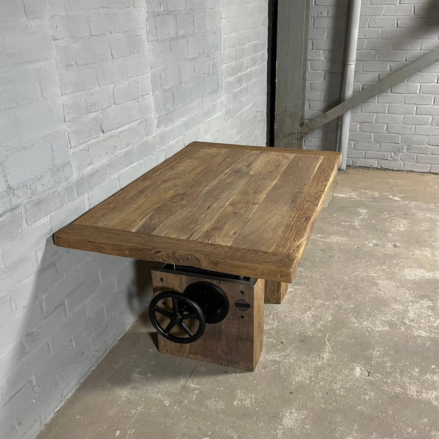 Deze stijlvolle eiken salontafel is in hoogte verstelbaar en daarom ook te gebruiken als eettafel.