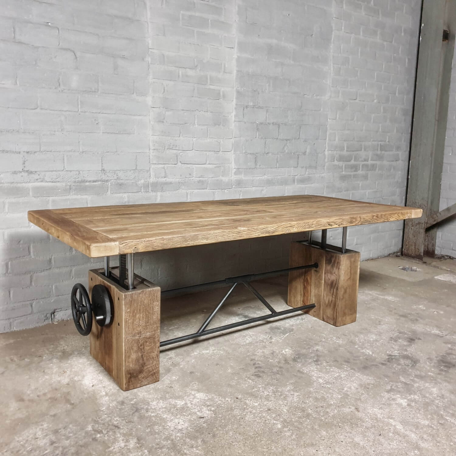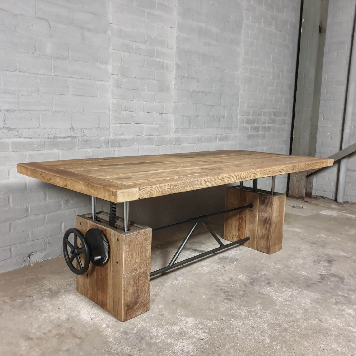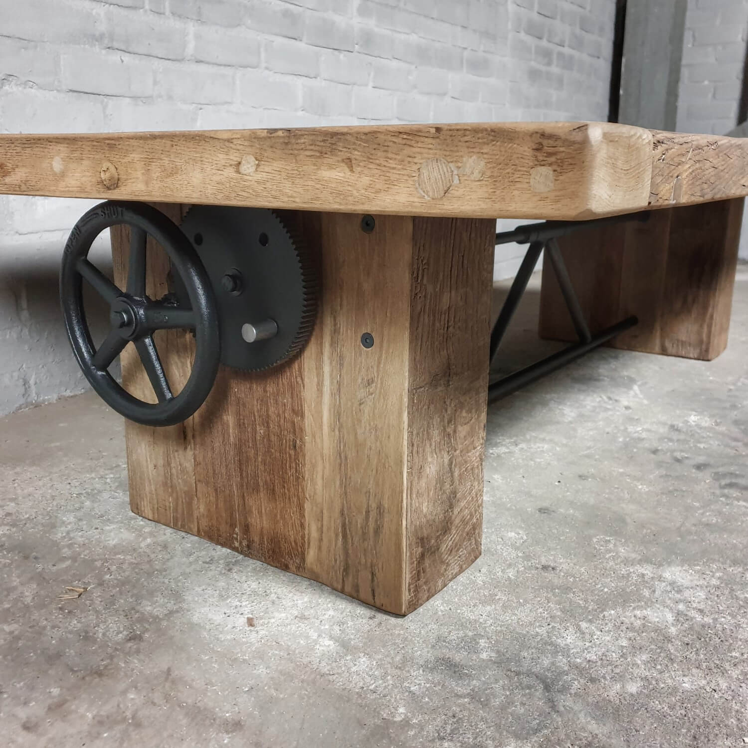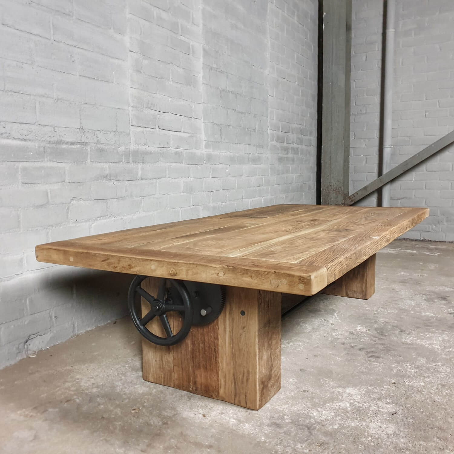 Deze stijlvolle eiken salontafel is in hoogte verstelbaar en daarom ook te gebruiken als eettafel.