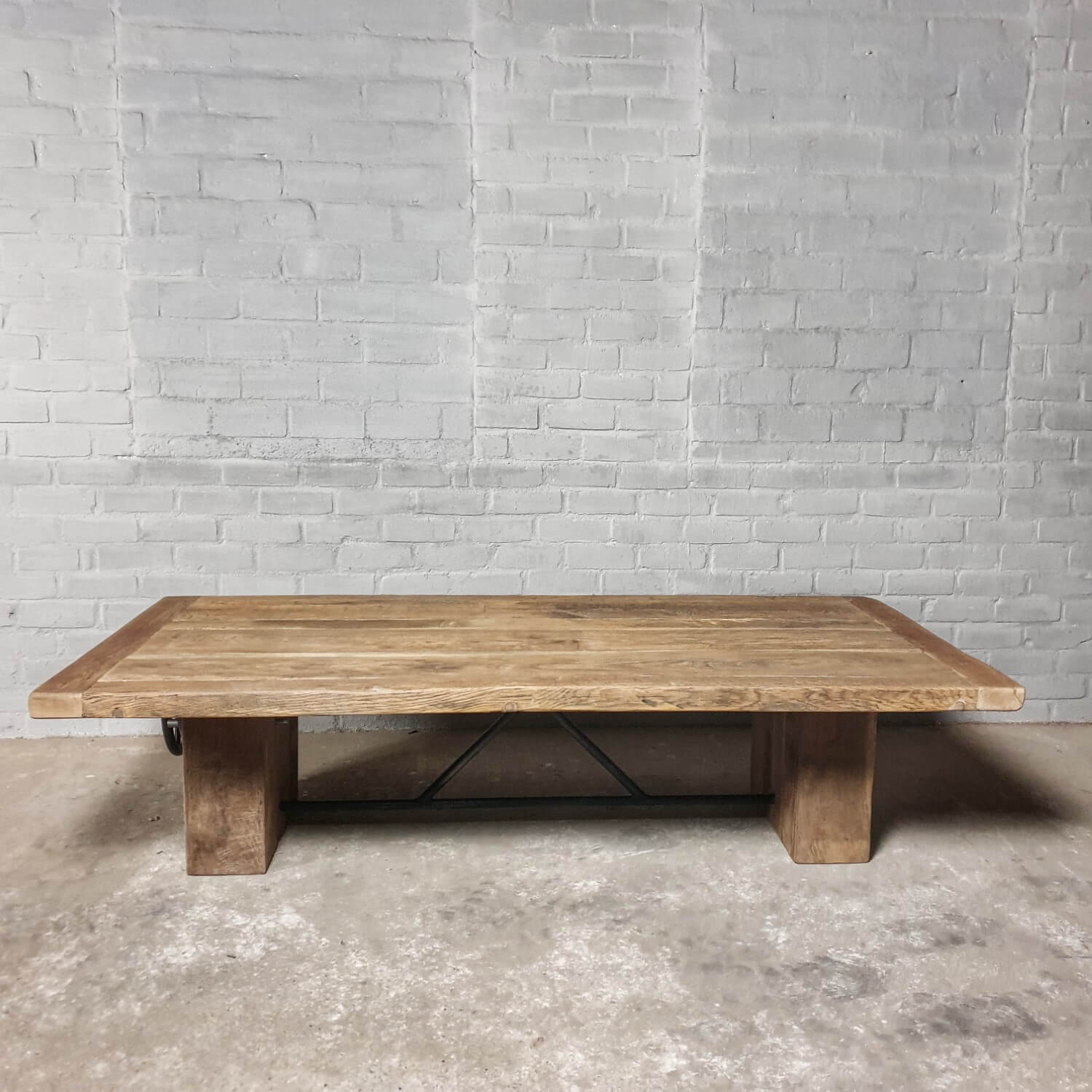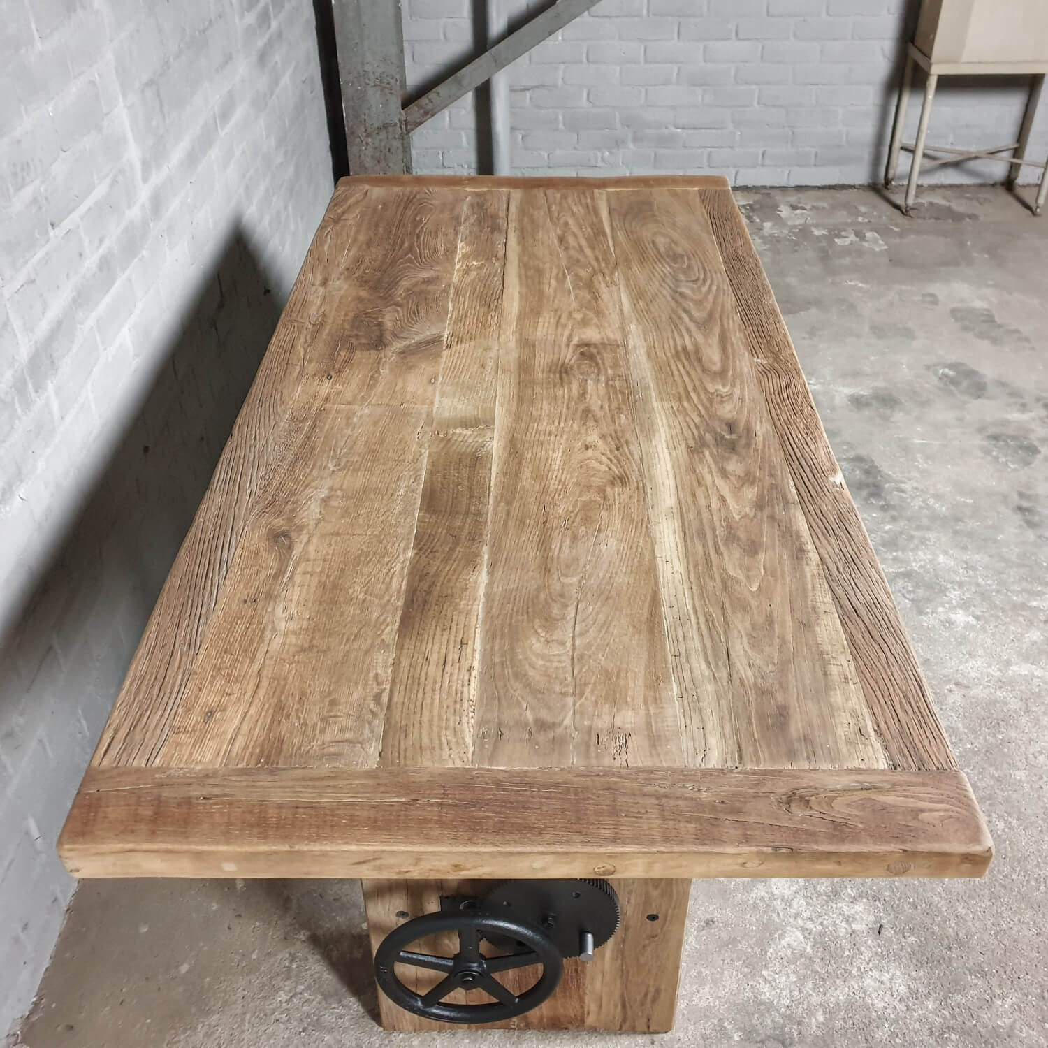 Het tafelblad van ca. 5cm dik en het onderstel zijn gemaakt van dun zonverbrand oud eiken (gezaagd uit de buitenkant van oude balken) dat is belijmd op meubelplaat. De buitenste randen zijn gemaakt van massieve planken. Doordat het eikenhout tientallen jaren lang als gevelbekleding in de zon verkleurd is heeft het een prachtige patine gekregen.