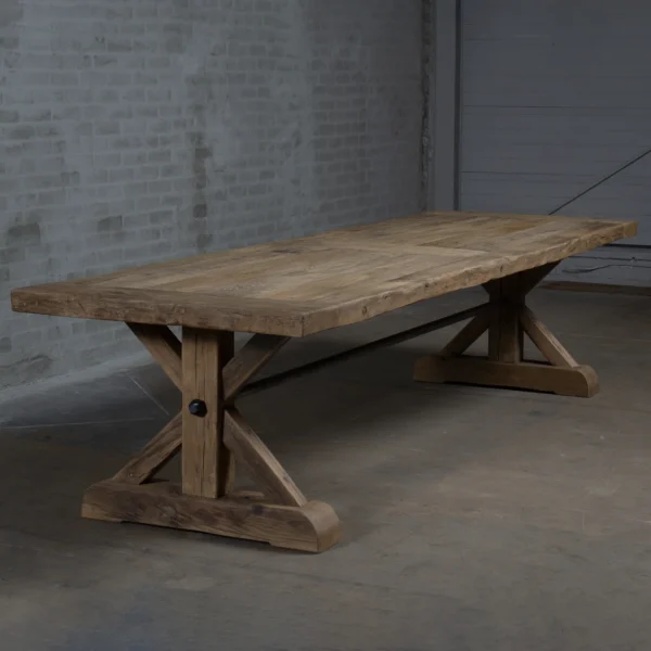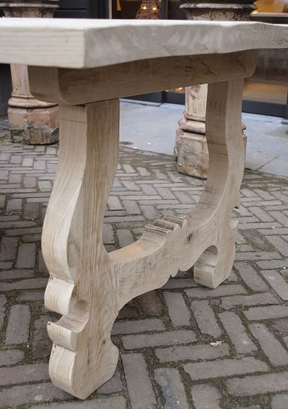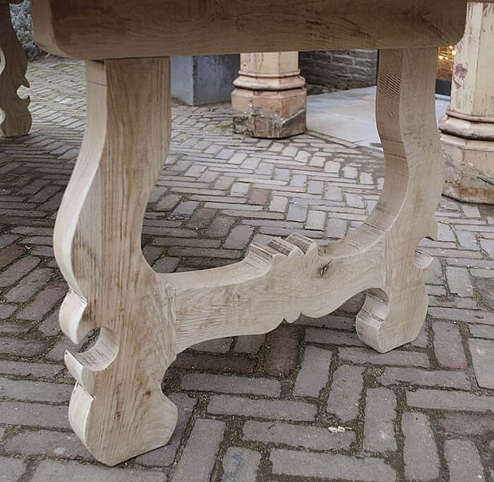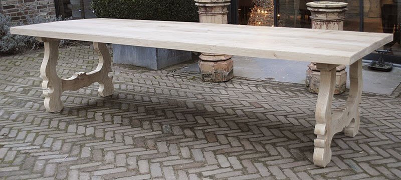 Rustieke eettafel met eikenhouten tafelblad in Haciënda stijl. Het tafelblad bestaat uit minimaal 6 massief eiken planken van ca 4,5cm dik. Deze tafel is door onszelf ontworpen en wordt op ambachtelijke wijze in onze eigen werkplaats gemaakt.