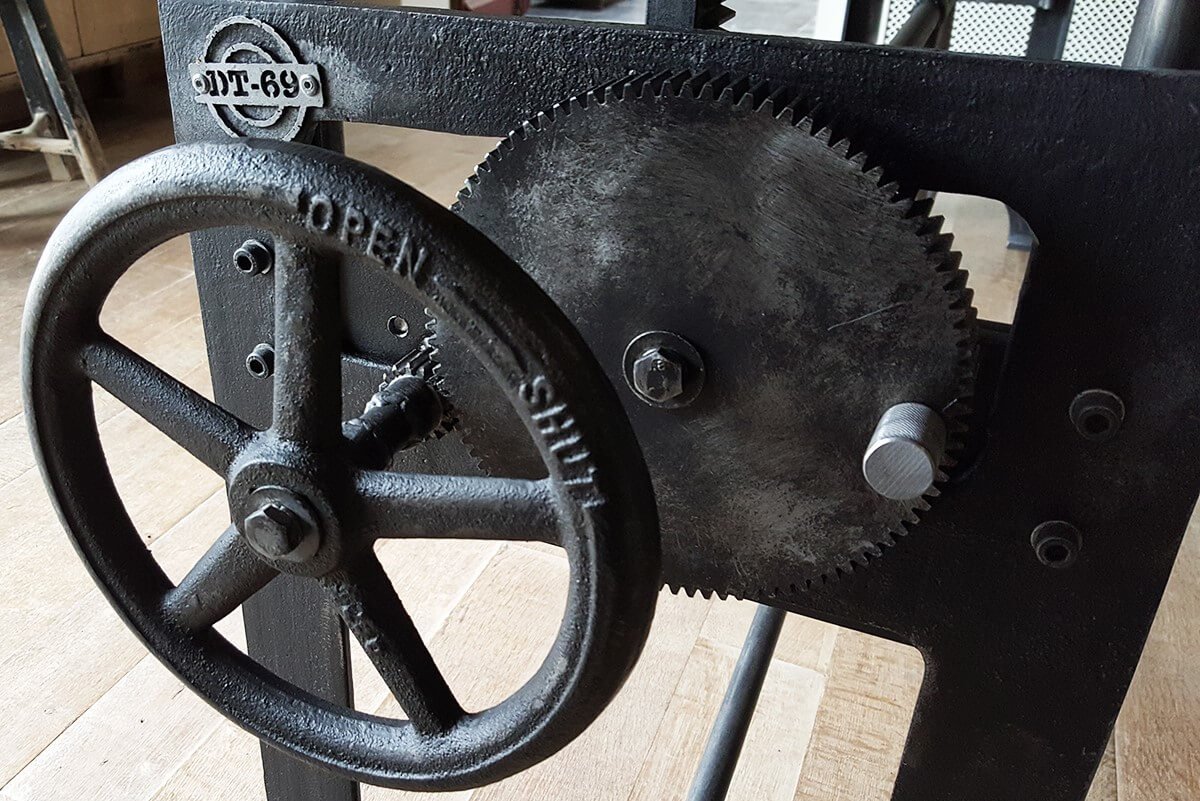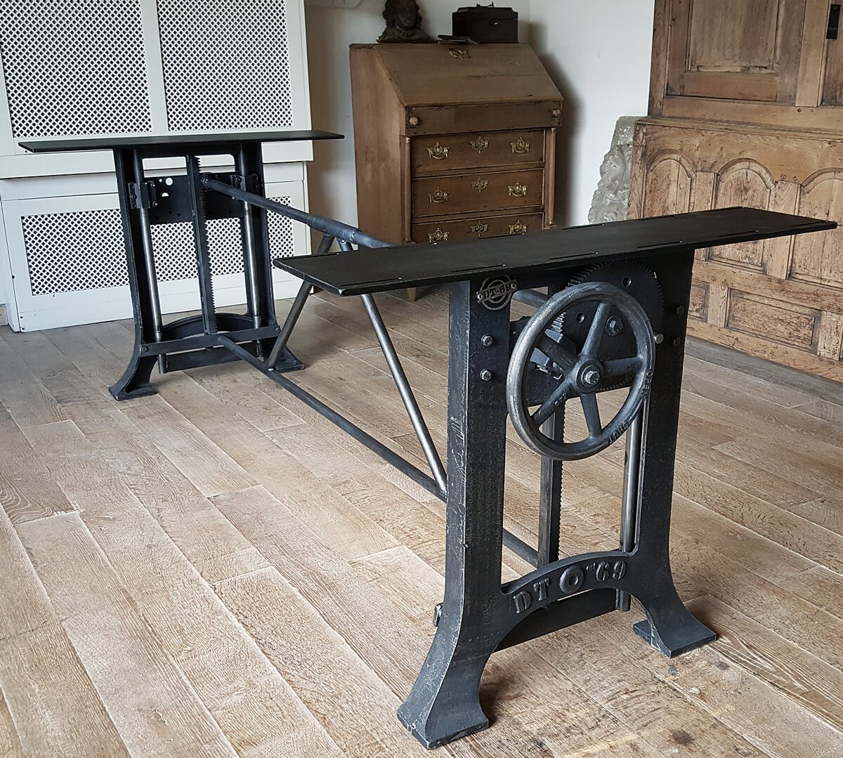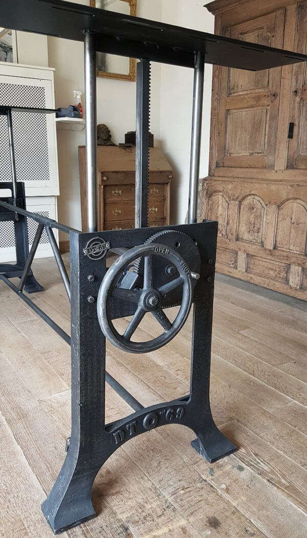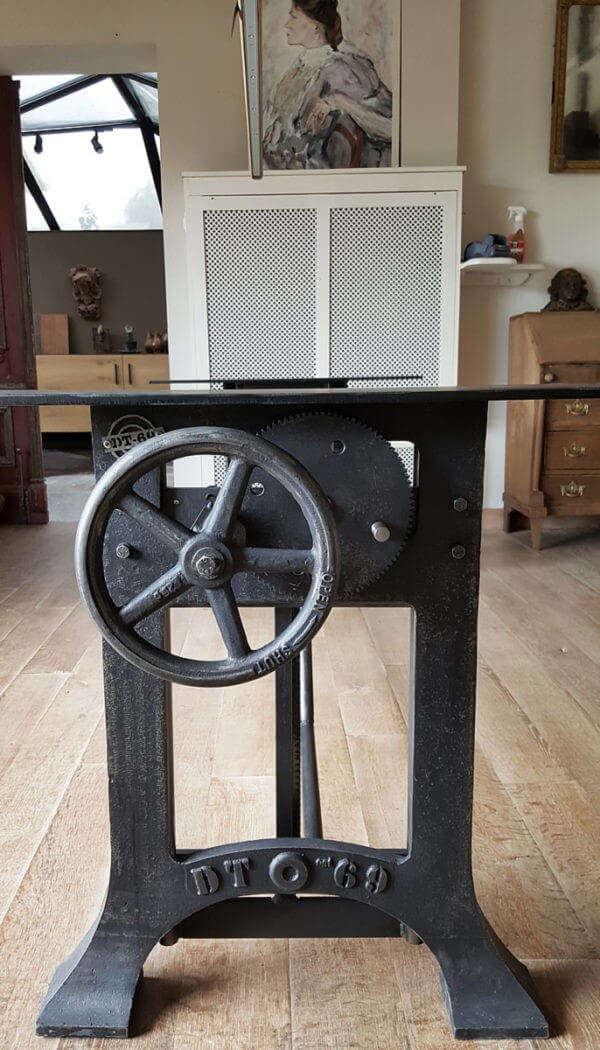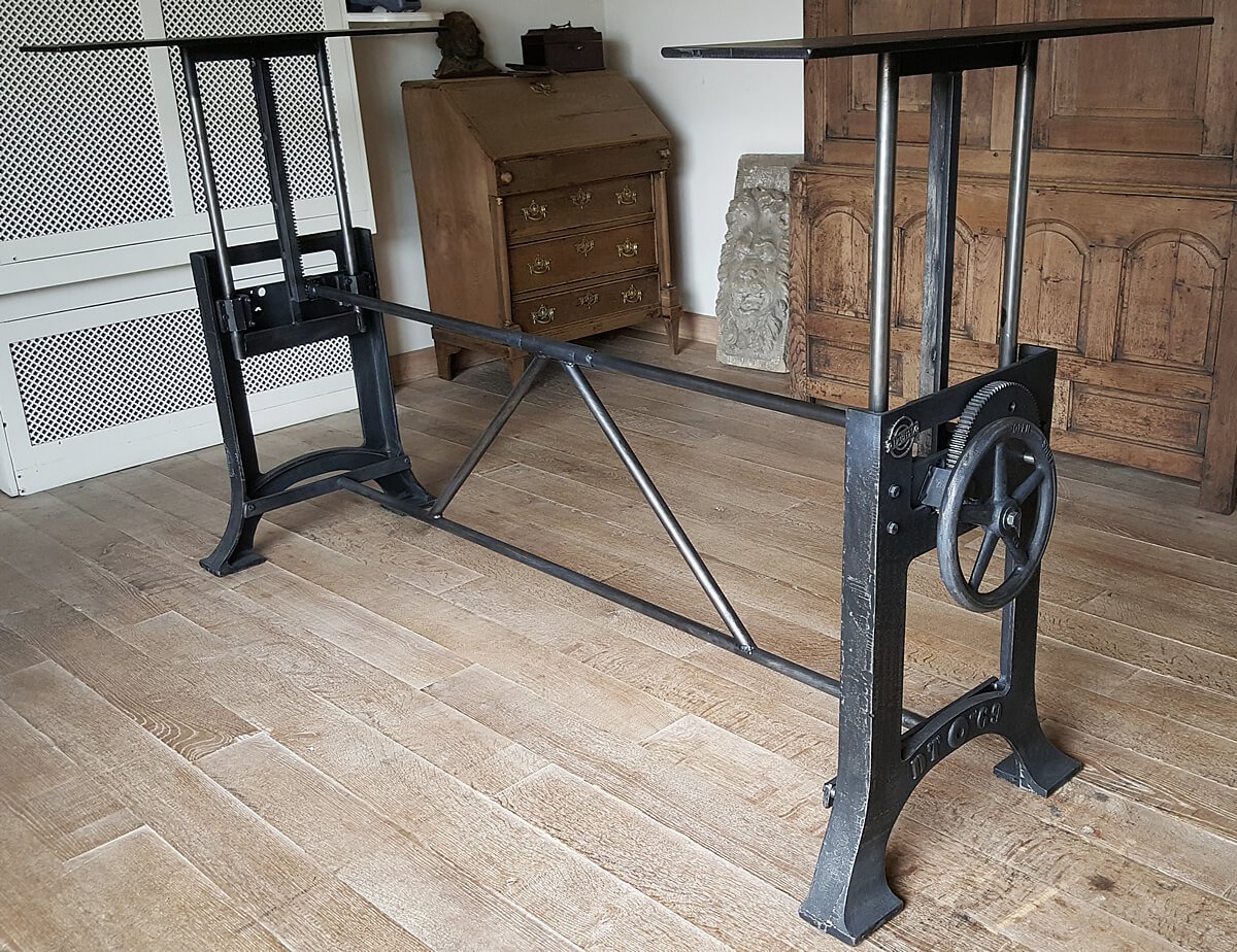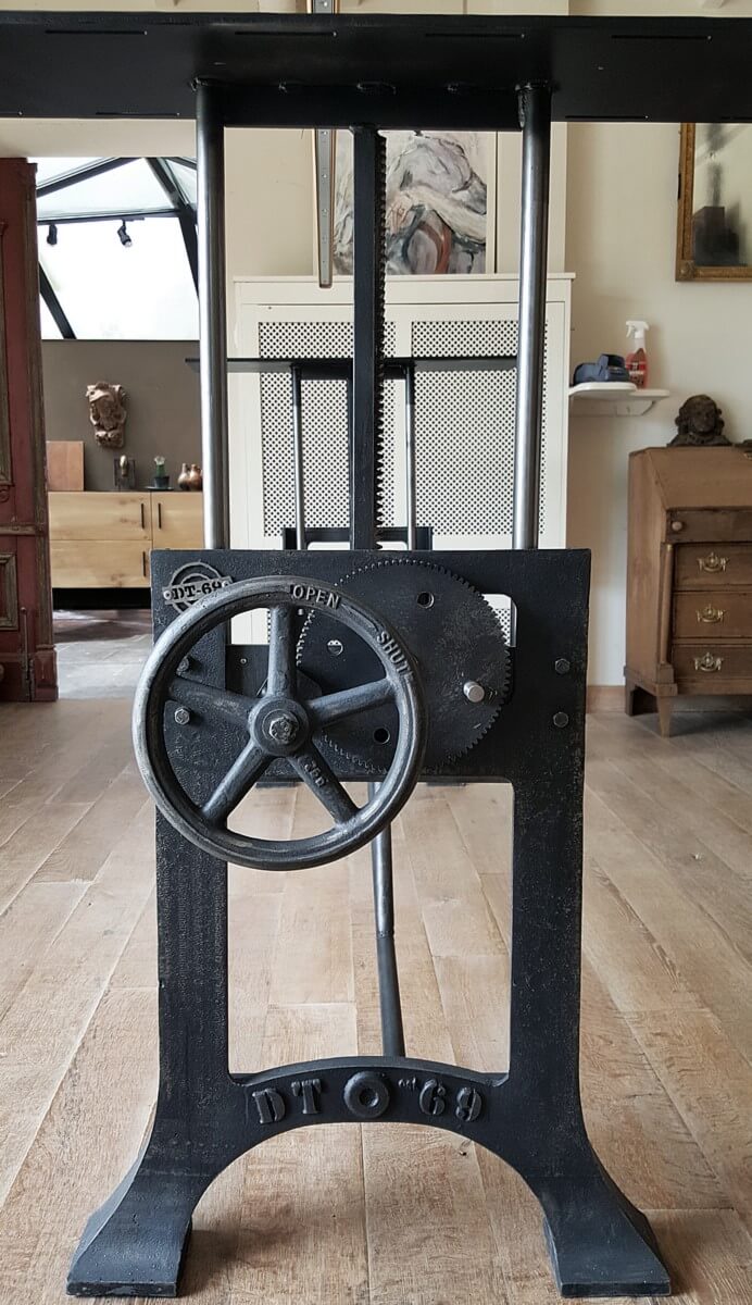 Dit industriële gietijzeren onderstel heeft een in hoogte verstelbaar mechanisme verwerkt in de poten. Dit mechanisme kan gebruikt worden om een tafelblad omhoog en omlaag te draaien van 71cm naar 112cm hoog. Zo is een tafel met dit onderstel bijvoorbeeld te gebruiken als eetkamertafel (laag) en als bartafel (hoog). Maar denk ook aan het gebruiken van de keukentafel (laag) als staand bureau (hoog).