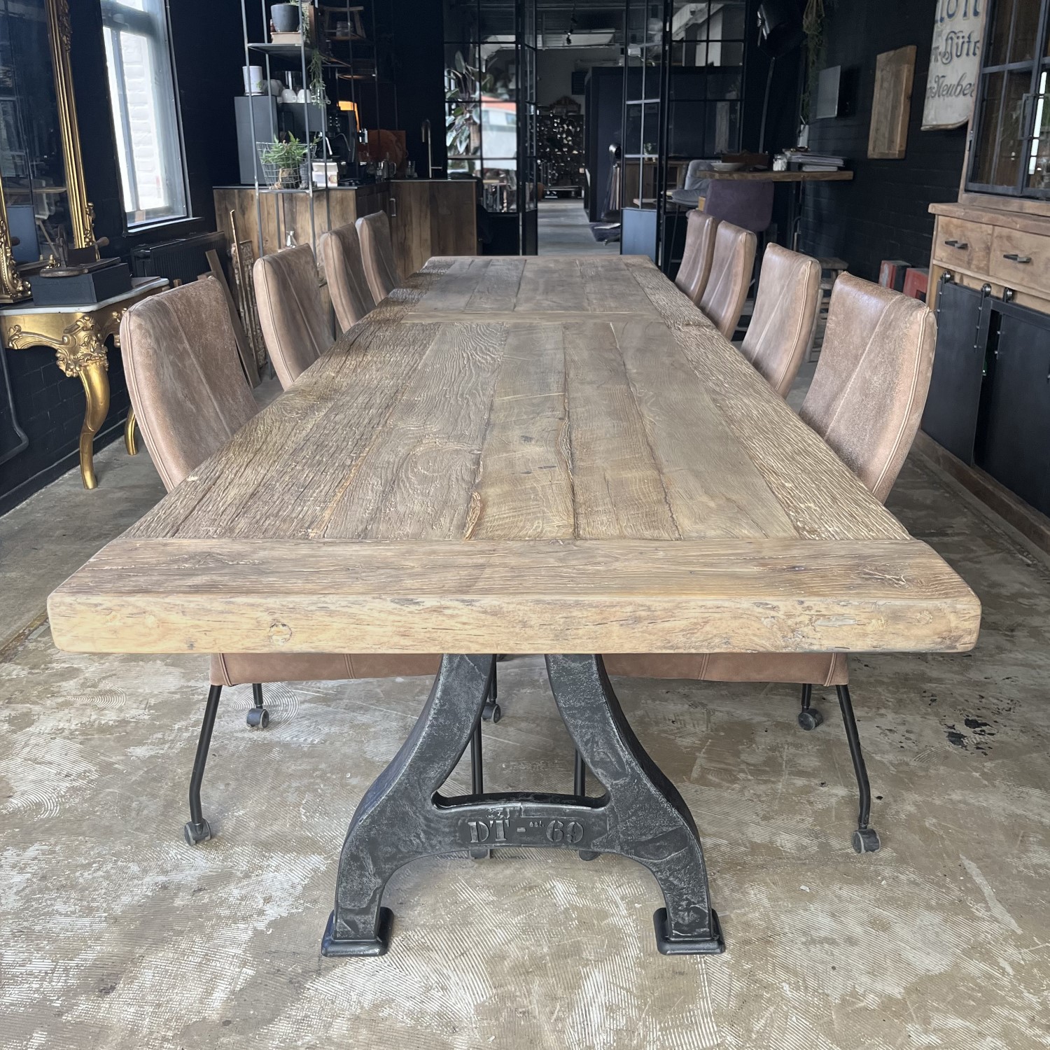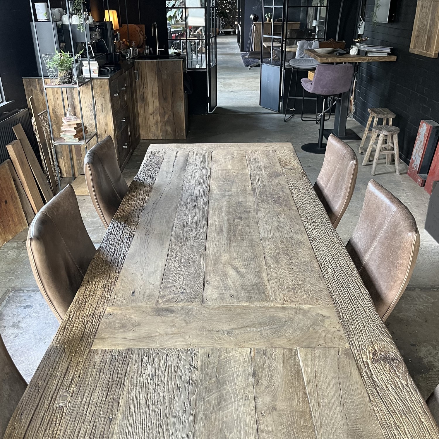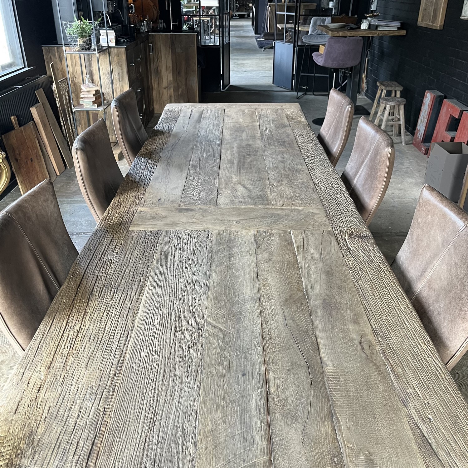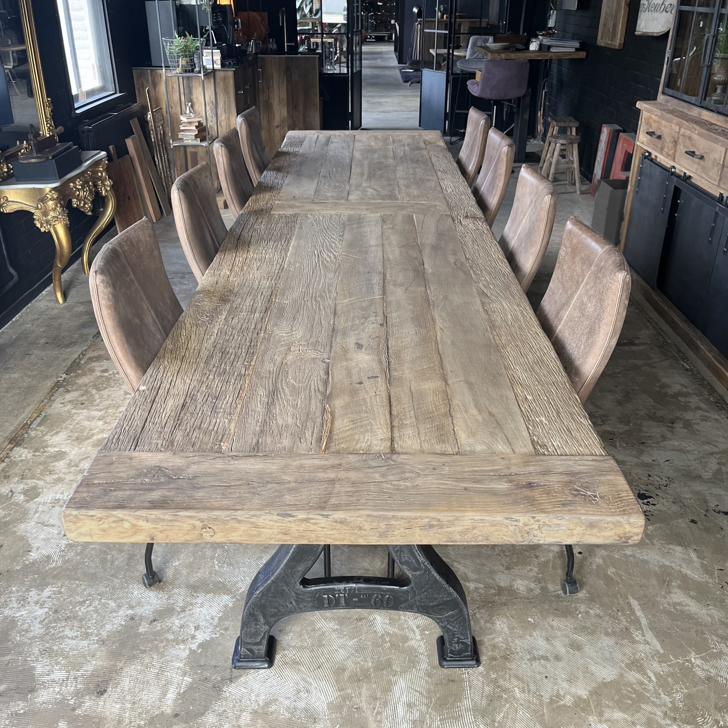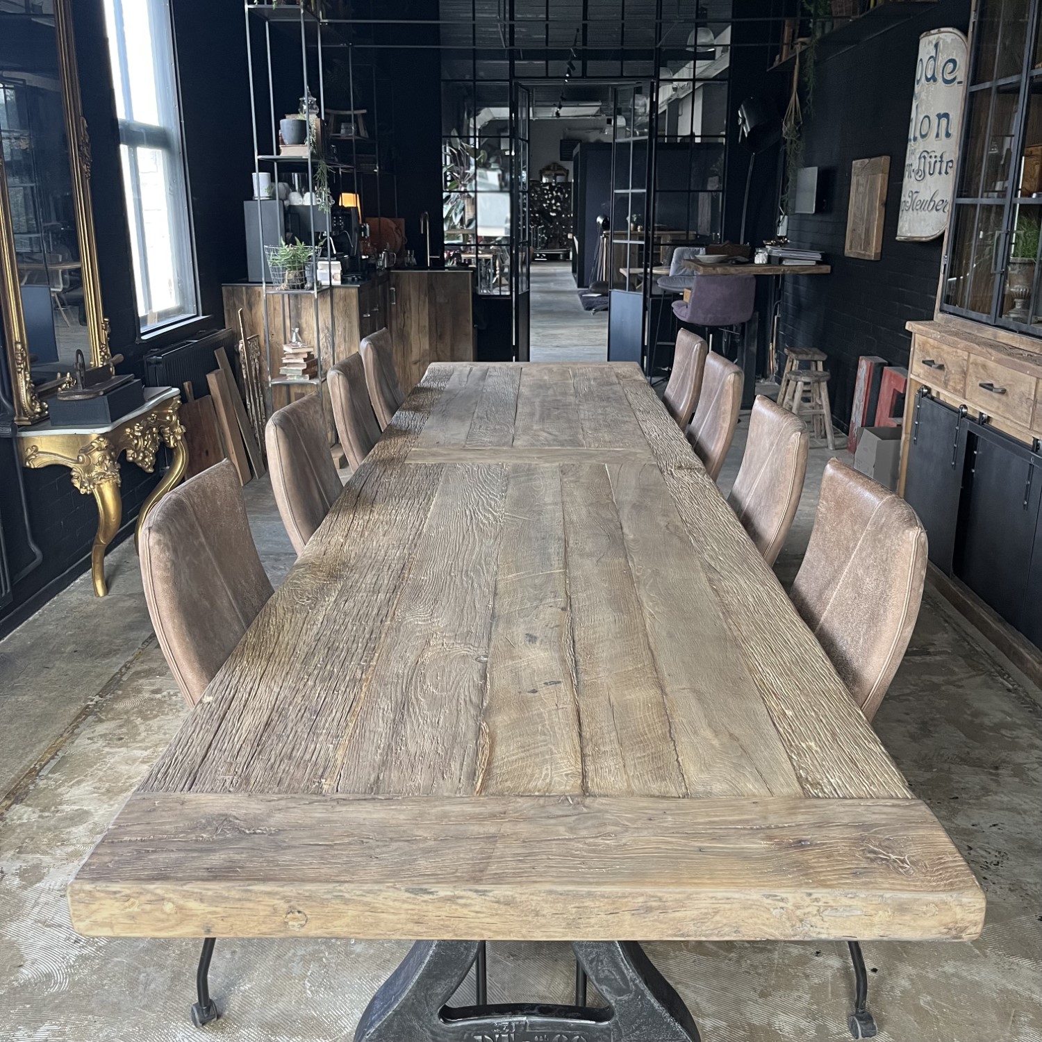 Deze lange industriële eettafel is in eigen werkplaats gemaakt van massief eikenhout en metalen tafelpoten. De combinatie van hout en ijzer is kenmerkend voor industriële meubelen en dat geeft de tafel dan ook zijn robuuste uiterlijk.