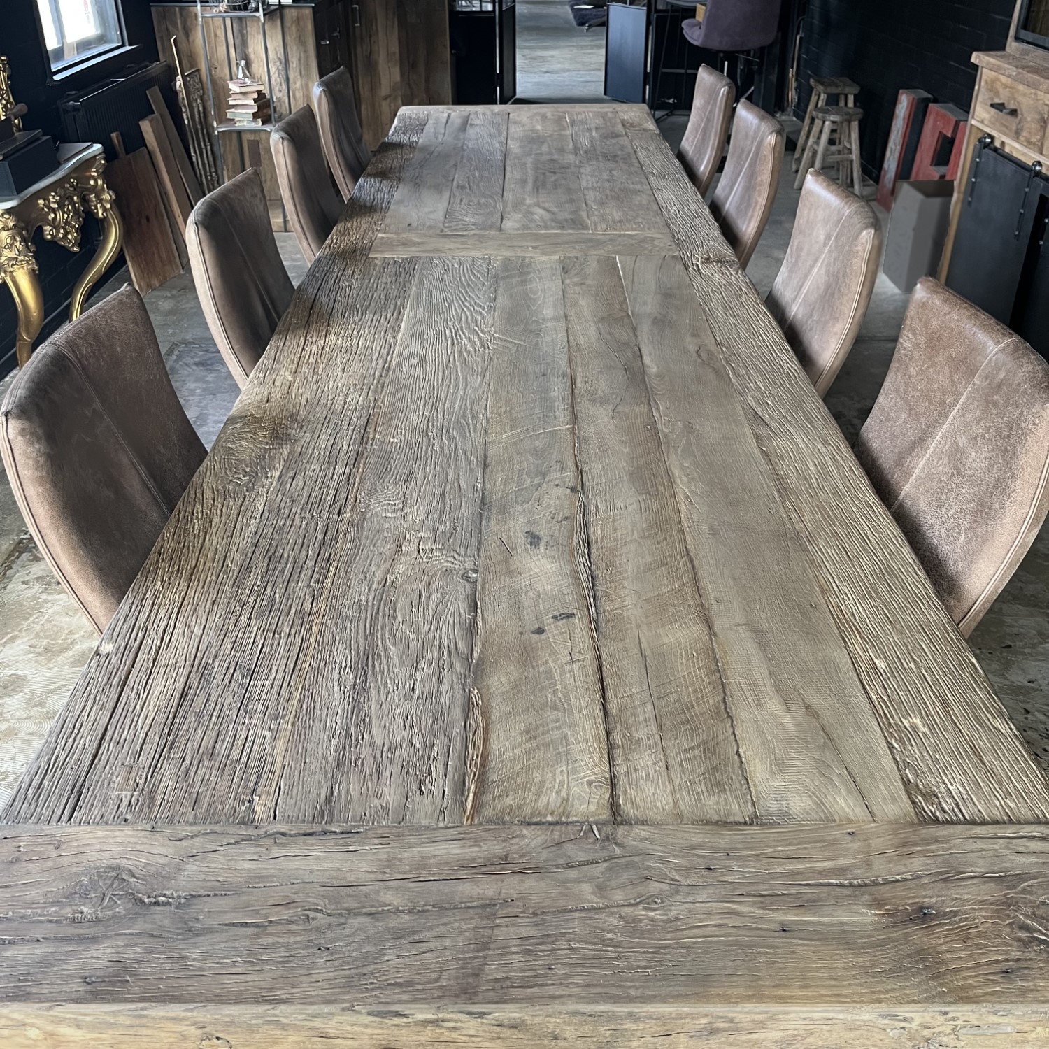 Het tafelblad zelf wordt gemaakt van ca. 7cm dik zonverbrand oud eikenhout (gezaagd uit de buitenkant van oude balken) dat is belijmd op een meubelplaat. De buitenste randen zijn gemaakt van massieve planken die versiert zijn met bijzondere details. Deze authentieke ornamenten op de buitenste balken geven de tafel karakter en maken hem bijzonder.