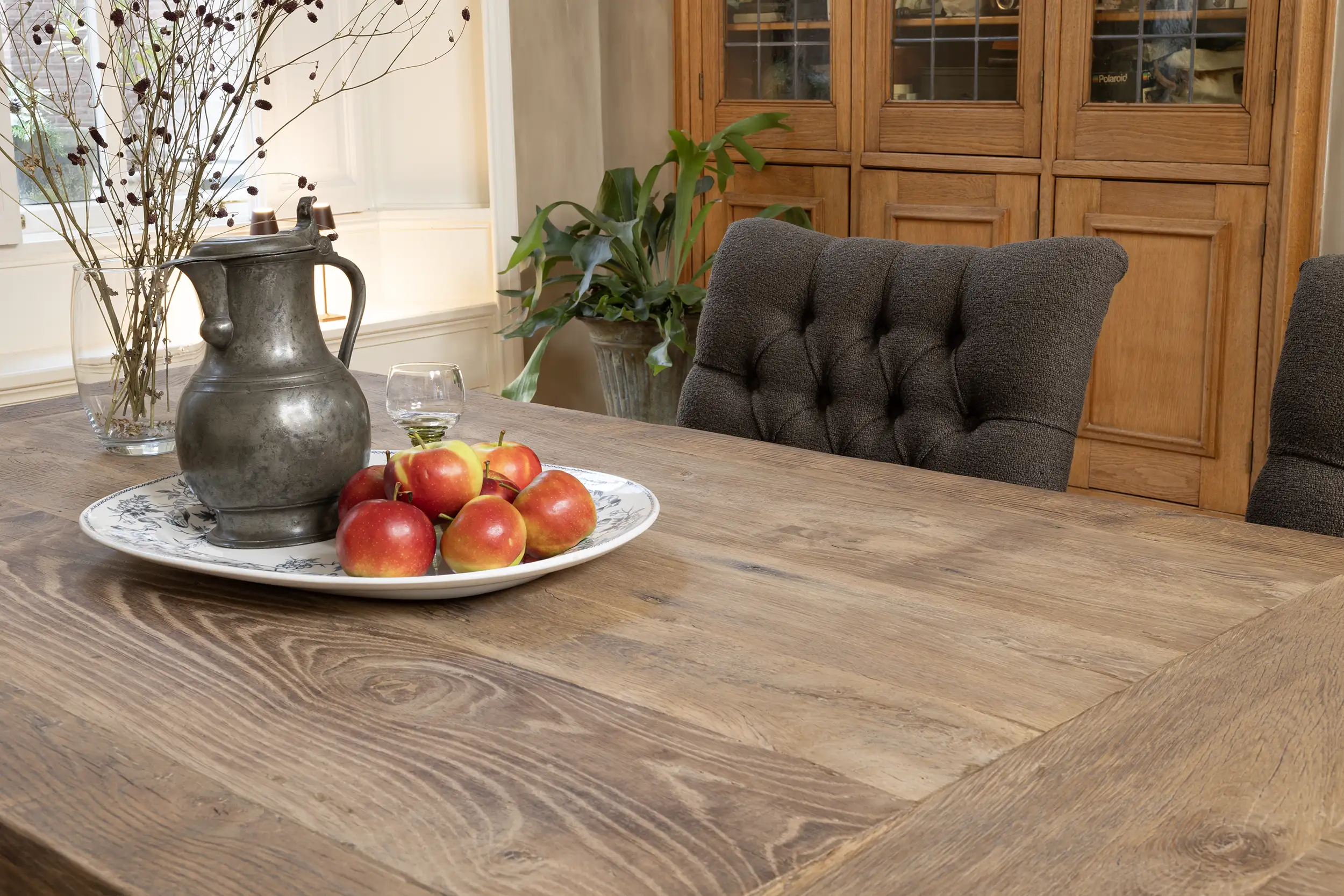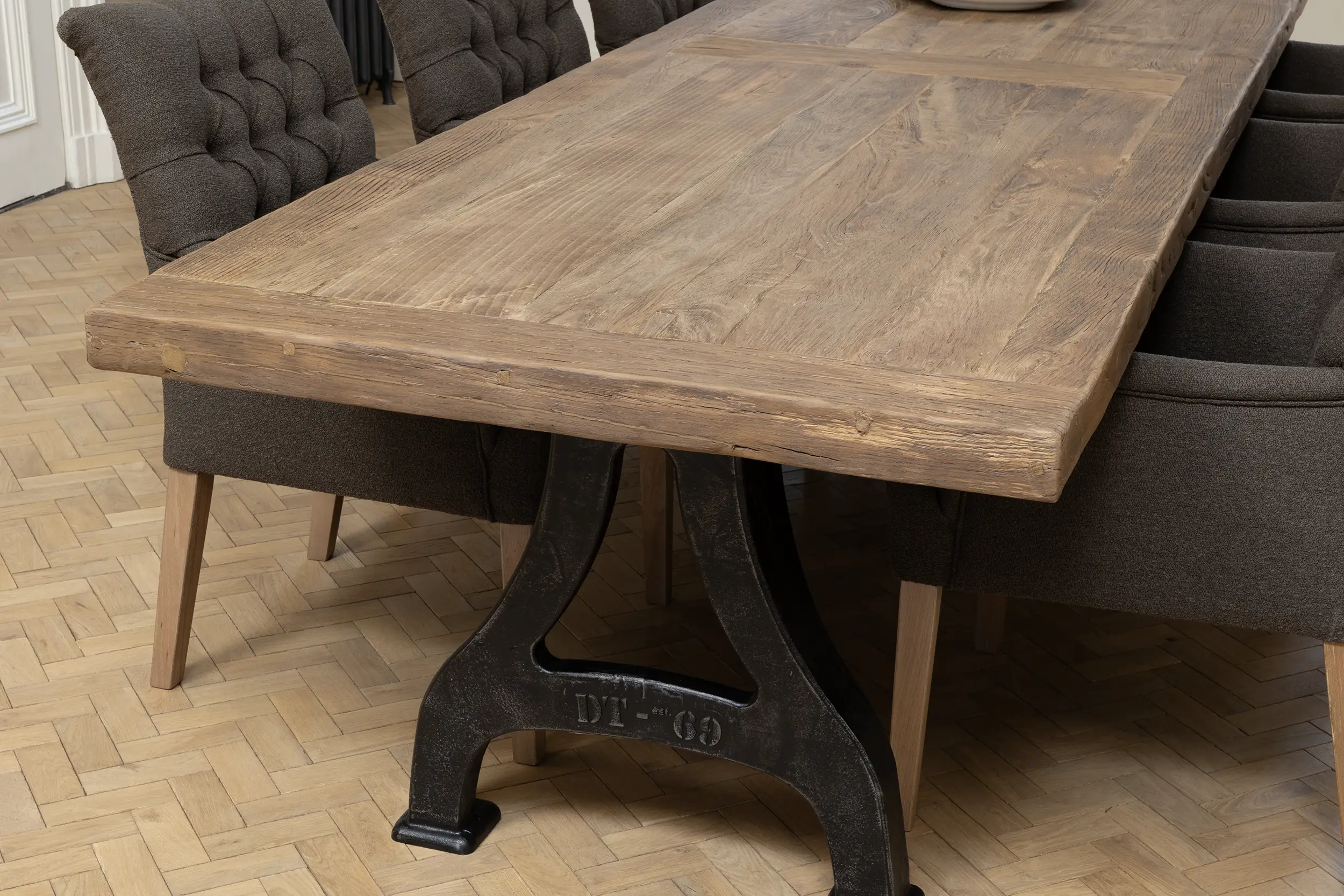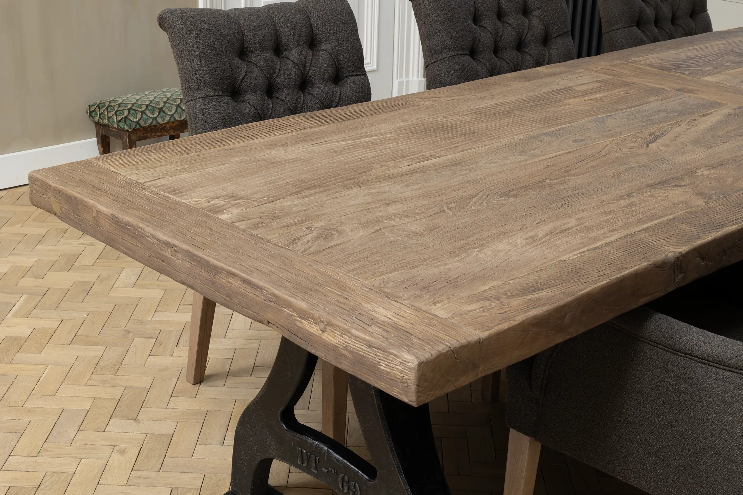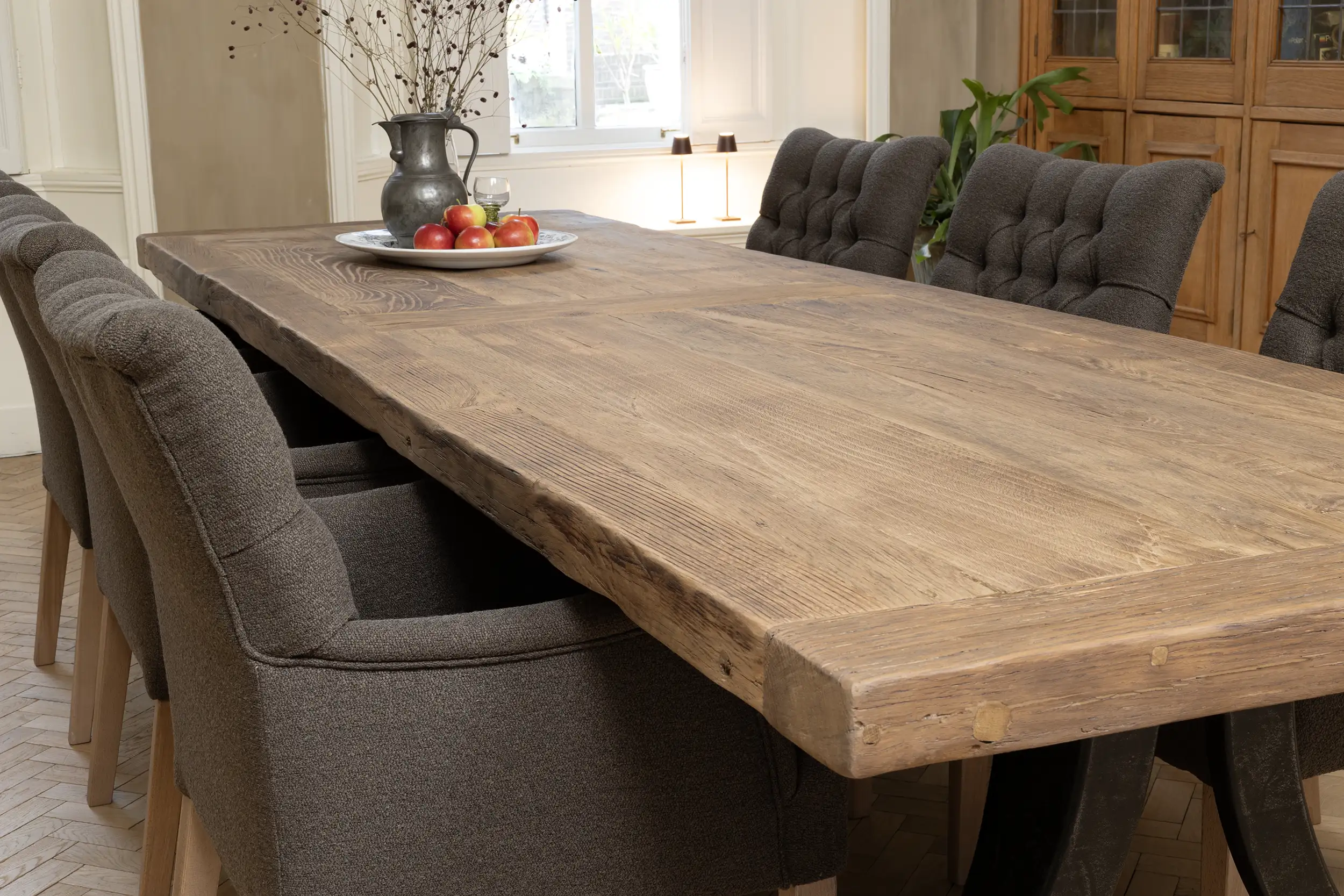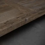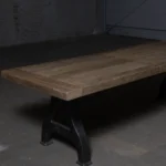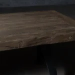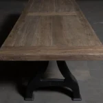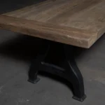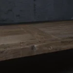 Het tafelblad wordt gemaakt van ca. 7cm dik zonverbrand oud eikenhout (gezaagd uit de buitenkant van oude balken) dat is belijmd op meubelplaat. De buitenste randen zijn gemaakt van massieve planken. Doordat het eikenhout tientallen jaren lang als gevelbekleding in de zon verkleurd is heeft het een prachtige patine gekregen. Het tafelblad is vlekvrij behandeld.
