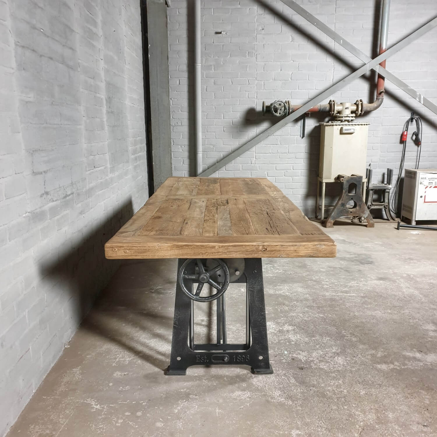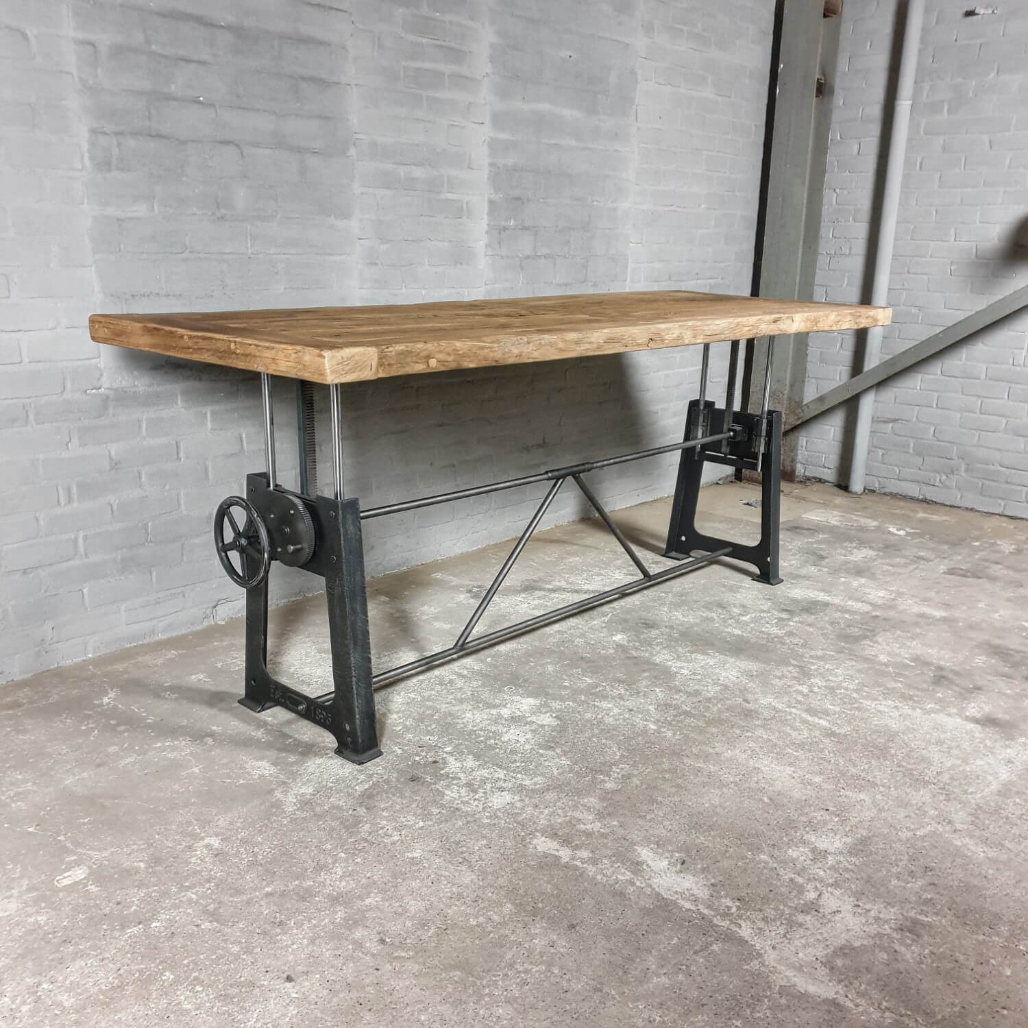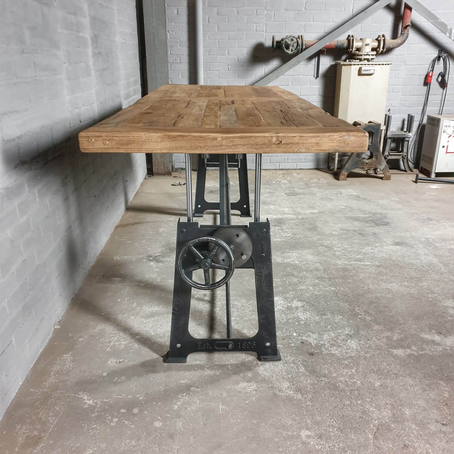 Deze stoere industriële tafel heeft een gietijzer hoogte verstelbaar onderstel. Gemakkelijk te verstellen van 76cm naar 114cm hoog (standaard hoogten). Te gebruiken als eettafel (laag) en als bartafel of staand bureau (hoog).
