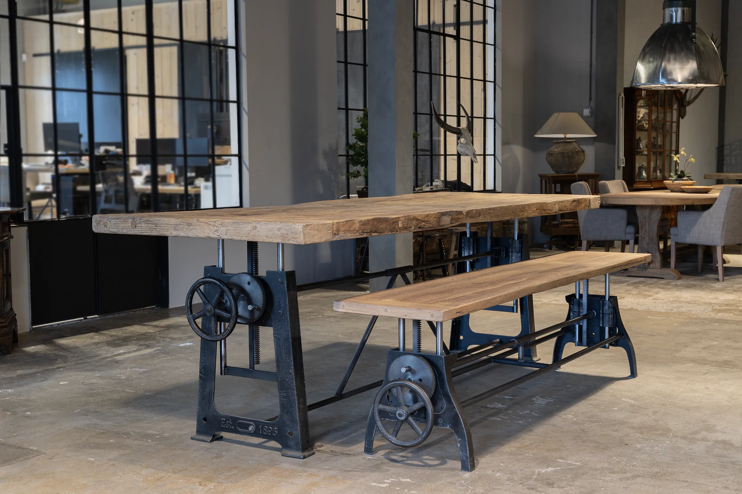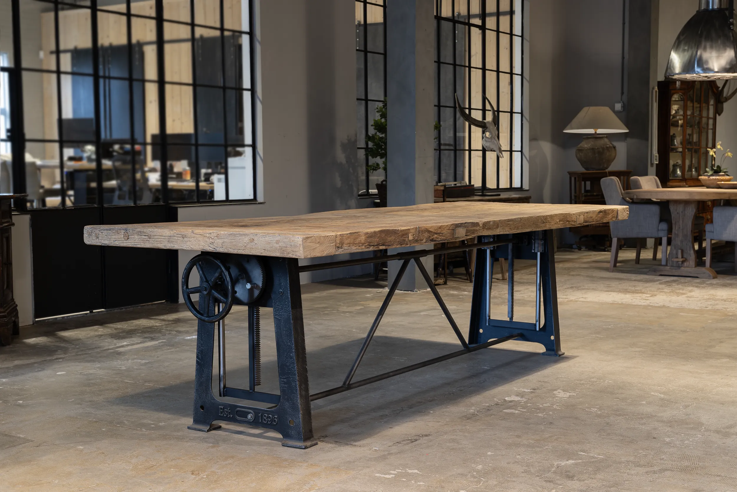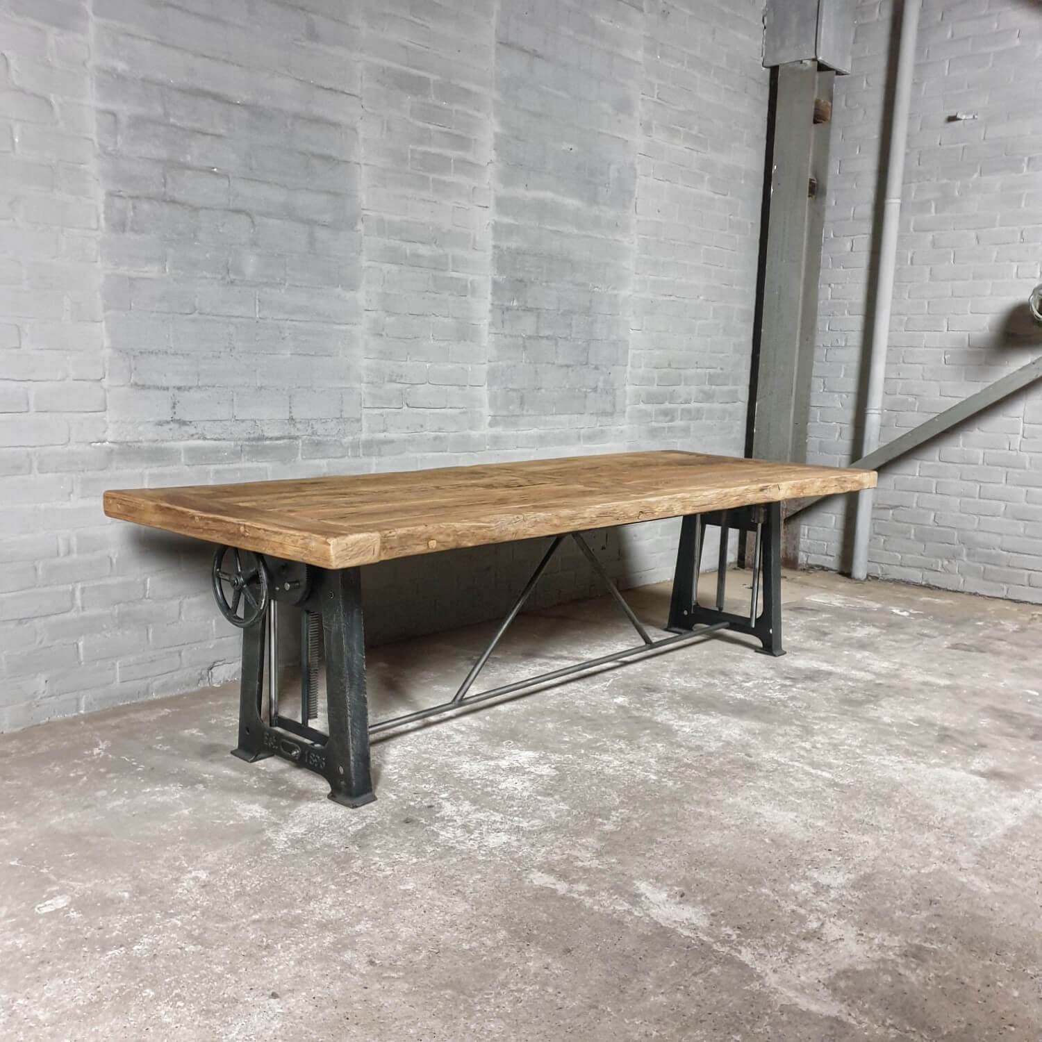Deze stoere industriële tafel heeft een gietijzer hoogte verstelbaar onderstel. Gemakkelijk te verstellen van 76cm naar 114cm hoog (standaard hoogten). Te gebruiken als eettafel (laag) en als bartafel of staand bureau (hoog).