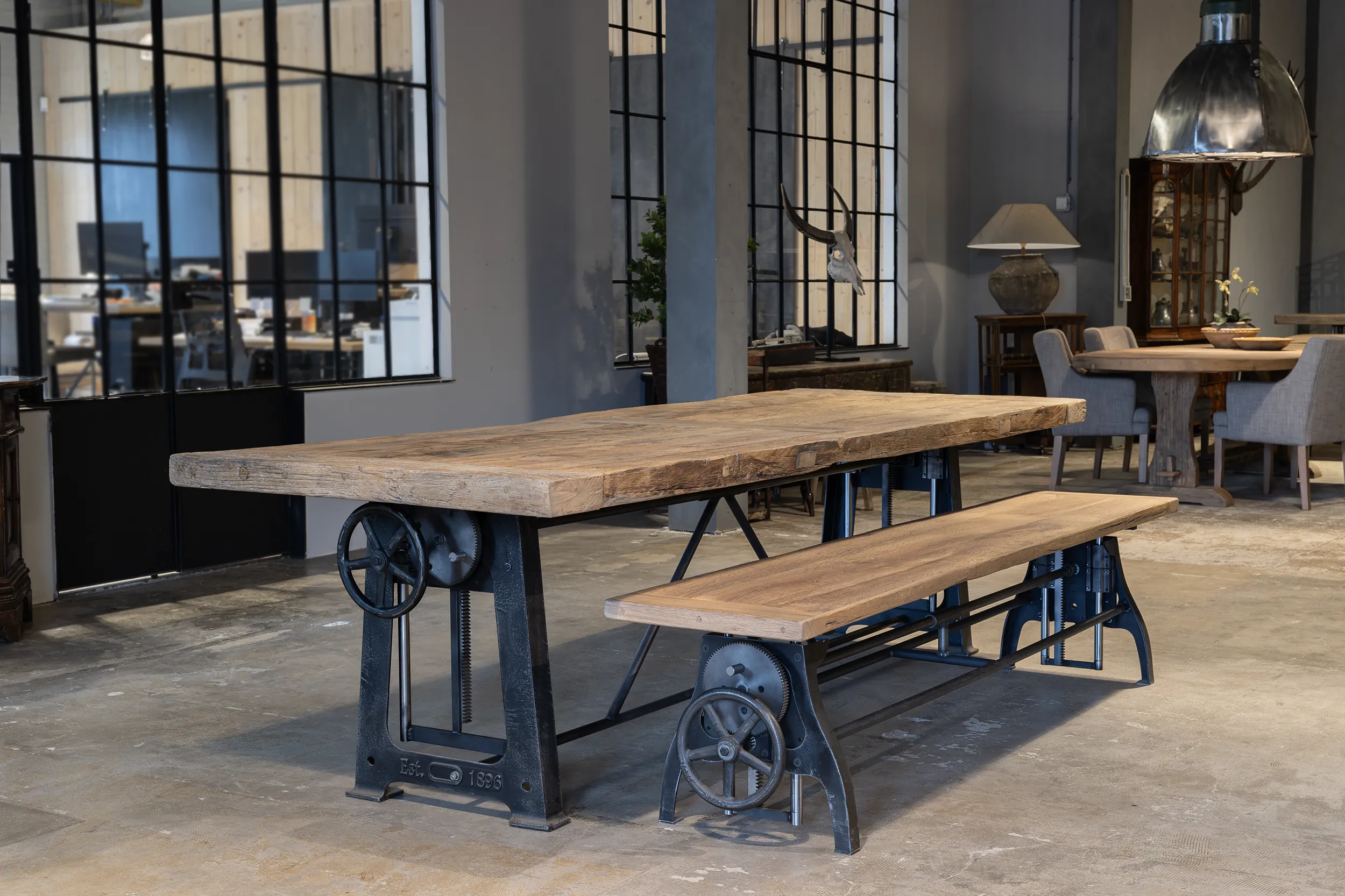 Het tafelblad is gemaakt van duurzaam oud eikenhout uit centraal Europa. De buitenrand van het tafelblad is gemaakt van 7cm dikke massieve balken. De binnenkant is gemaakt van oude planken die op een meubelplaat zijn bevestigd.