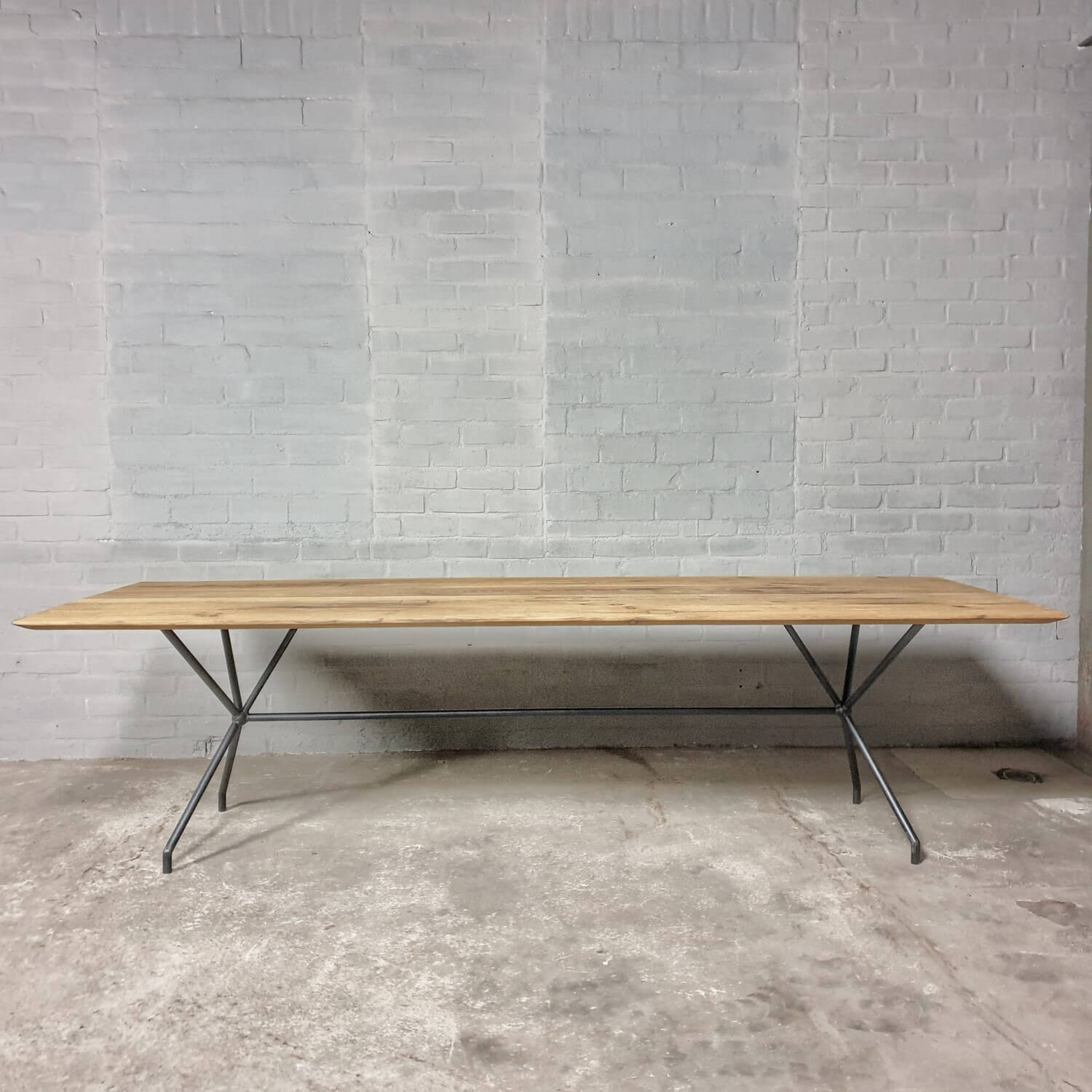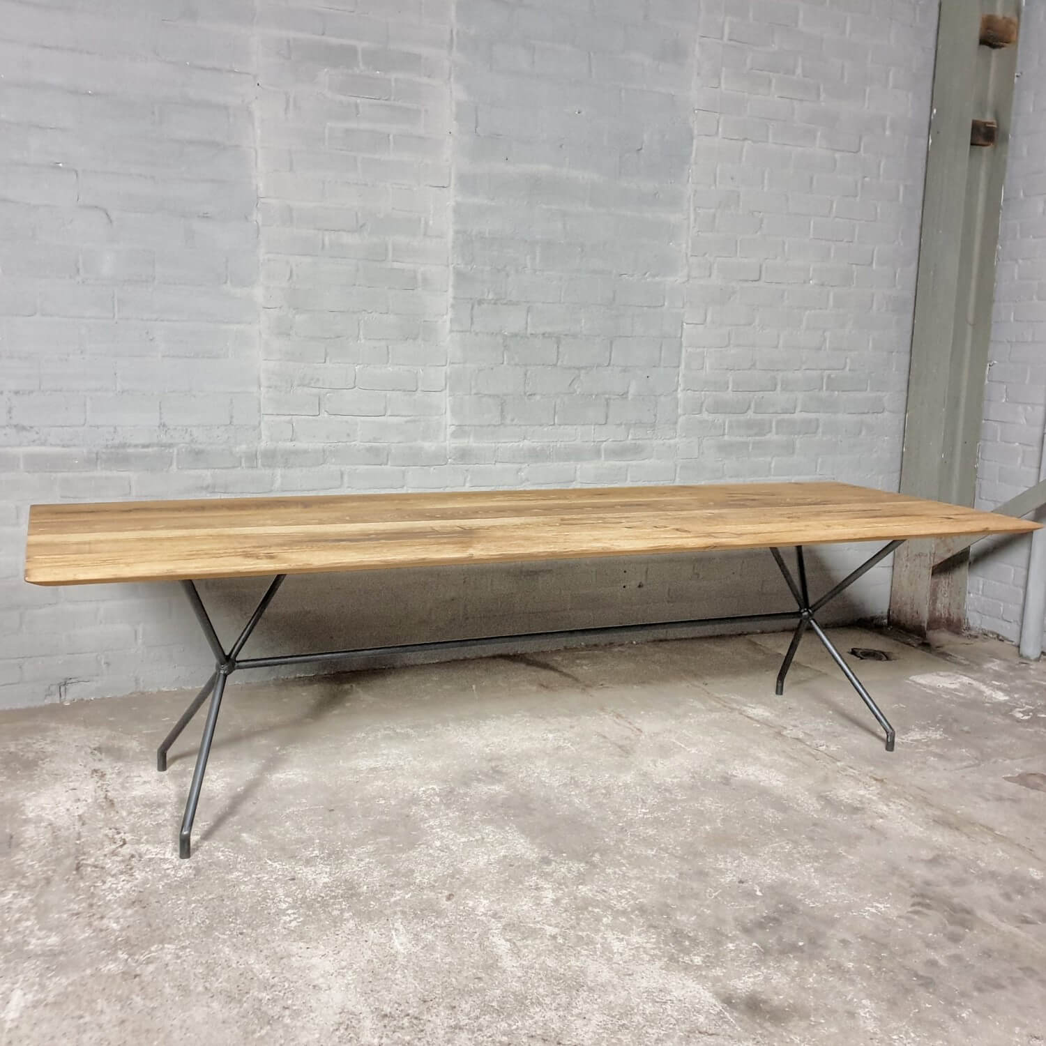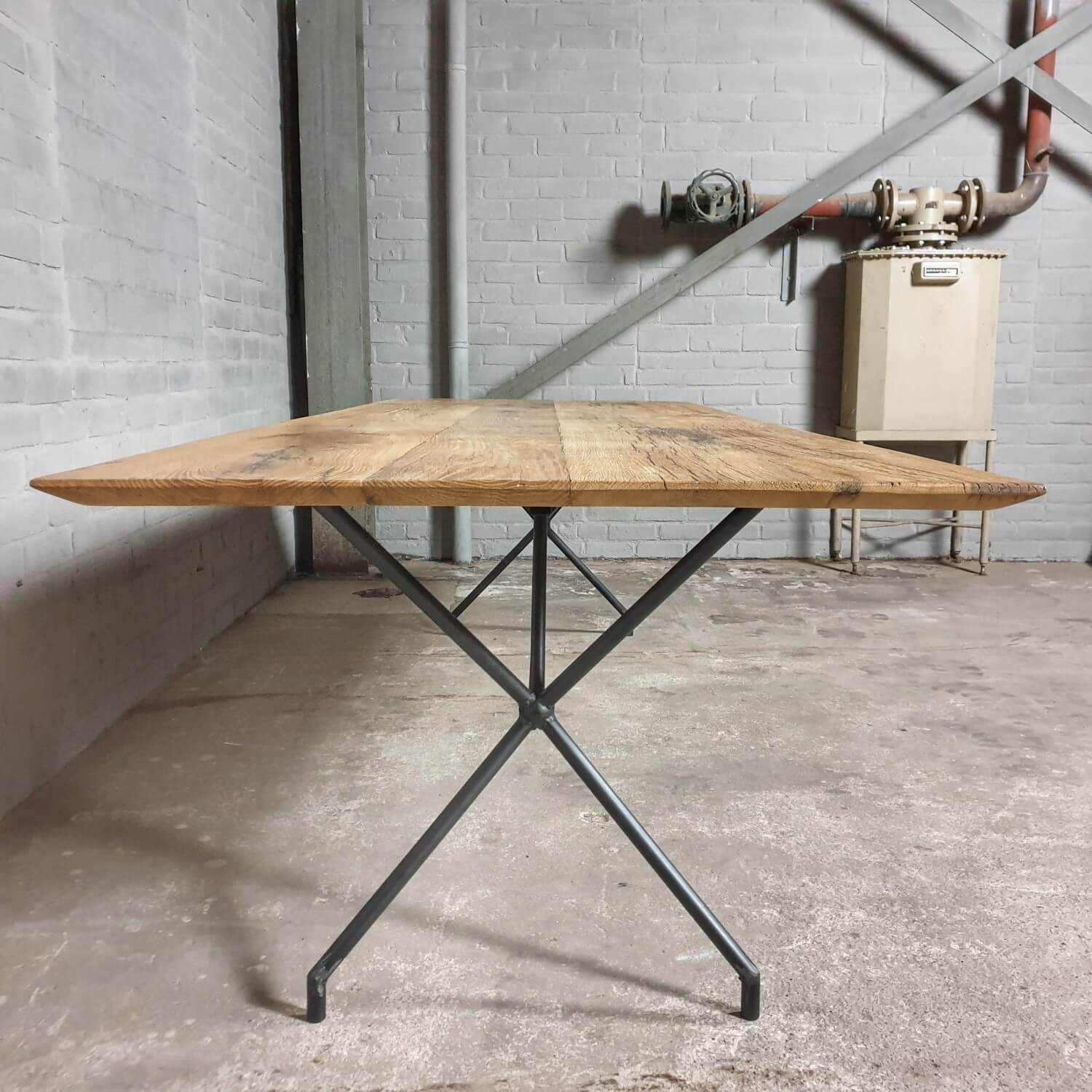 Deze stijlvolle eettafel heeft een elegant stalen onderstel waardoor het een moderne uitstraling heeft. Het tafelblad is gemaakt van massief oud eikenhout en zo behandeld dat het karakter van het hout mooi naar voren komt. Een opvallend detail van deze tafel is de facetrand die is aangebracht aan het tafelblad. Deze draagt verder bij aan de moderne en elegante uitstraling.