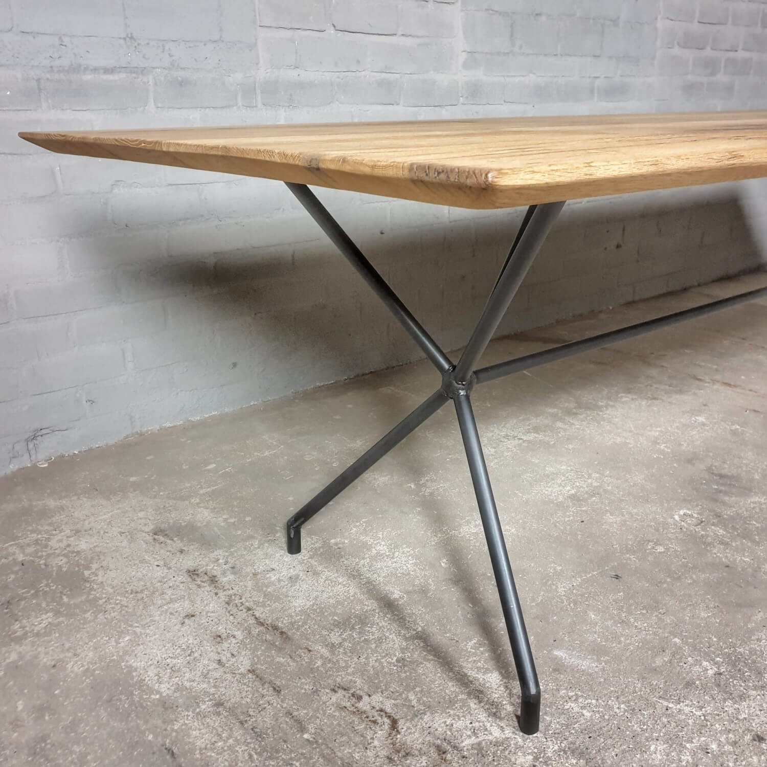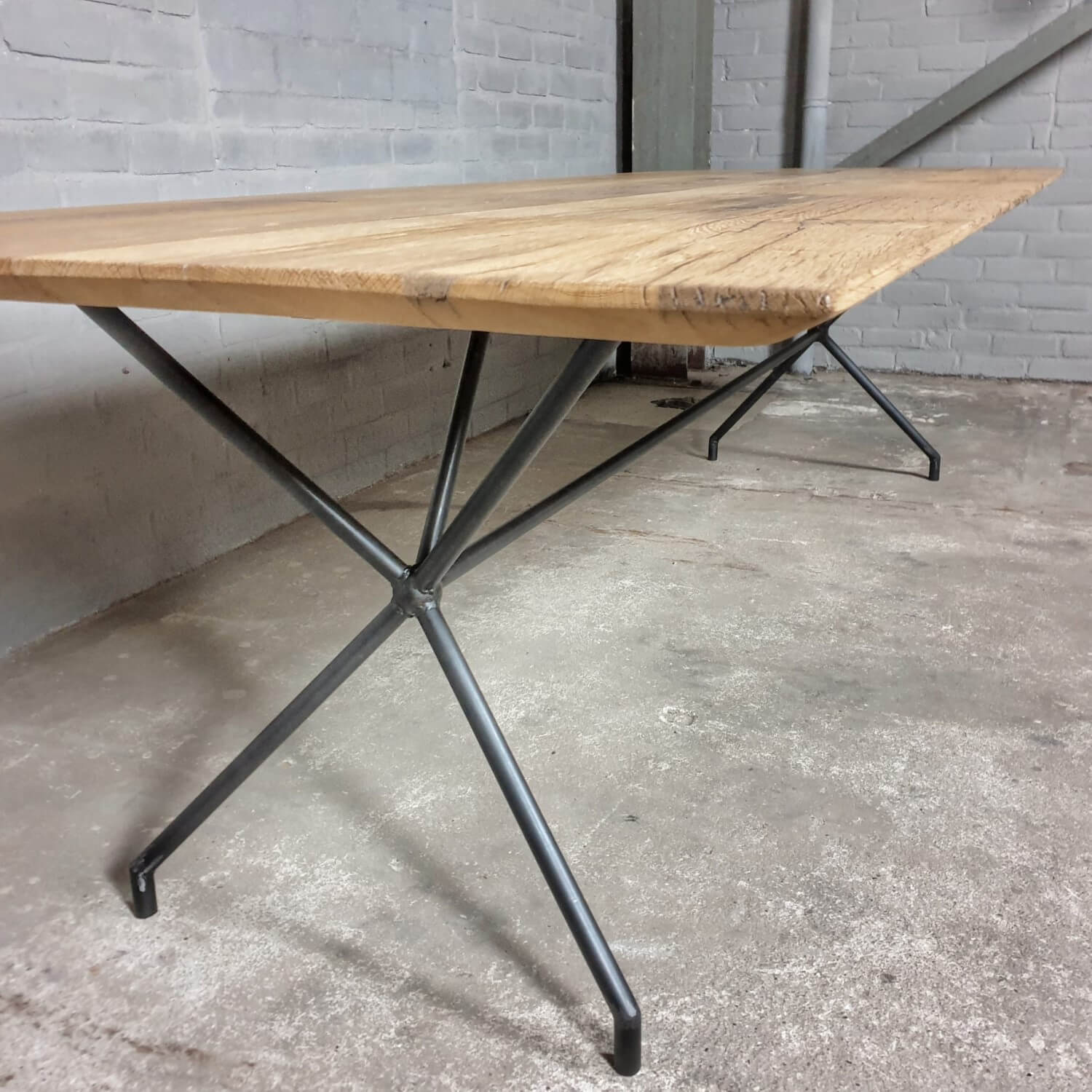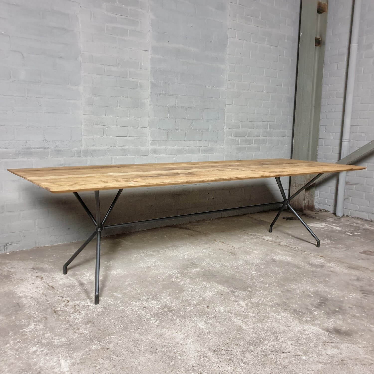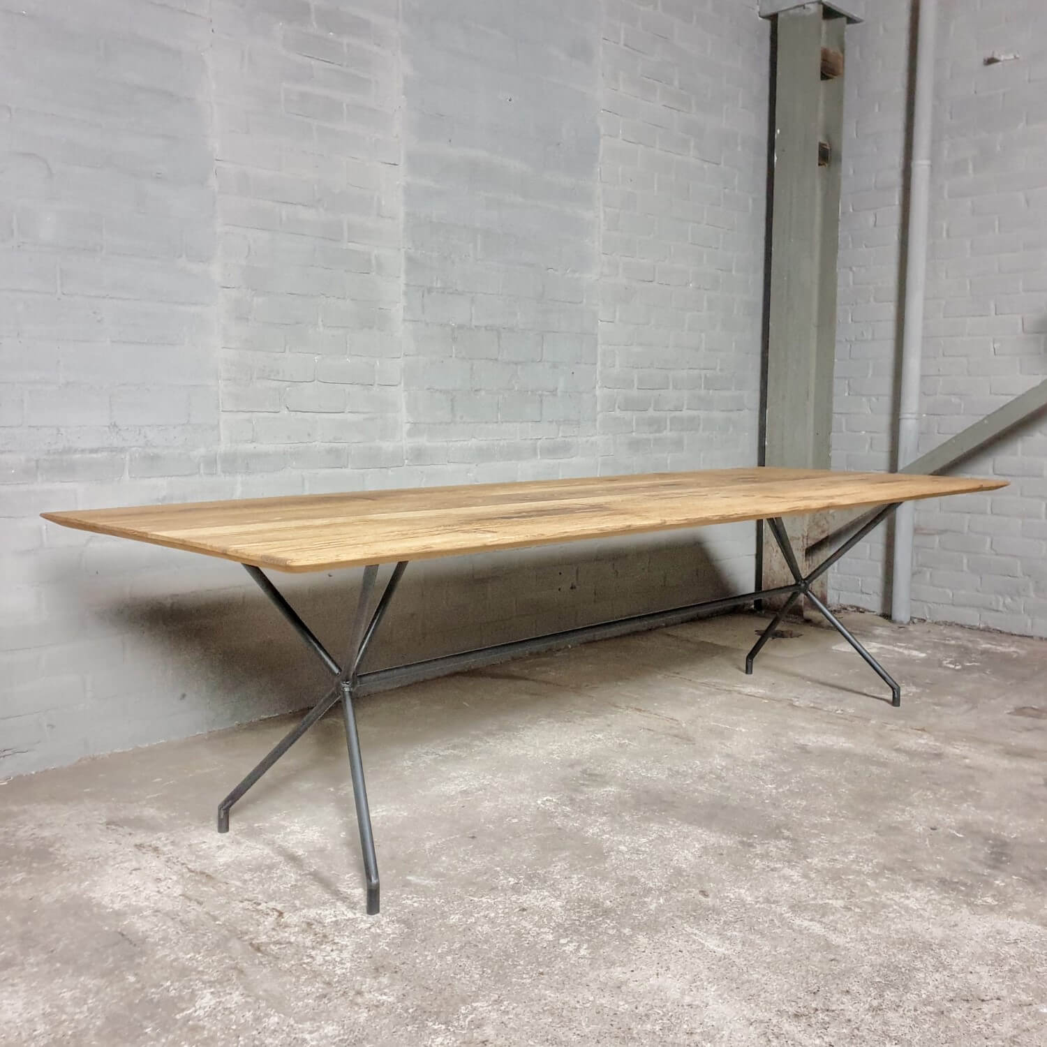 Deze stijlvolle eettafel heeft een elegant stalen onderstel waardoor het een moderne uitstraling heeft. Het tafelblad is gemaakt van massief oud eikenhout en zo behandeld dat het karakter van het hout mooi naar voren komt. Een opvallend detail van deze tafel is de facetrand die is aangebracht aan het tafelblad. Deze draagt verder bij aan de moderne en elegante uitstraling.