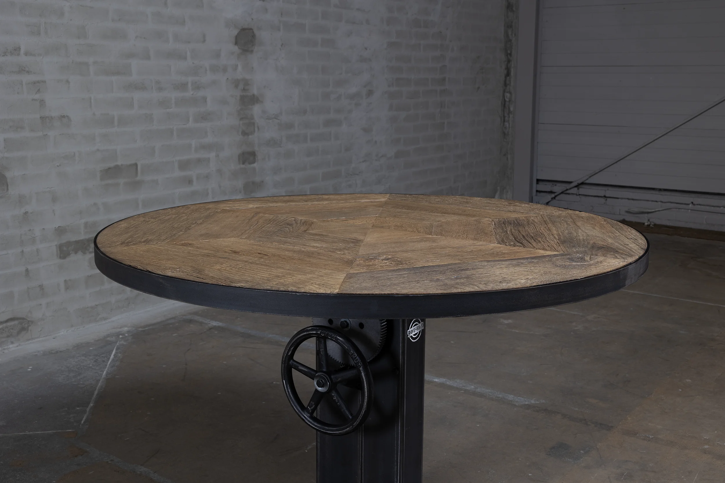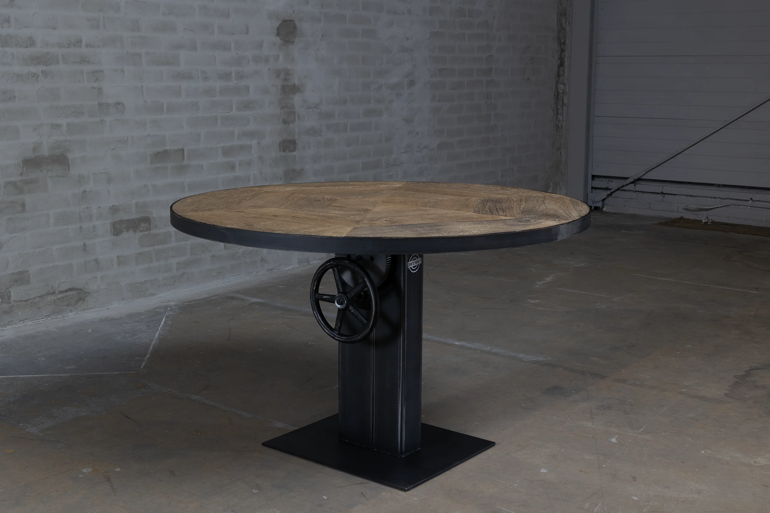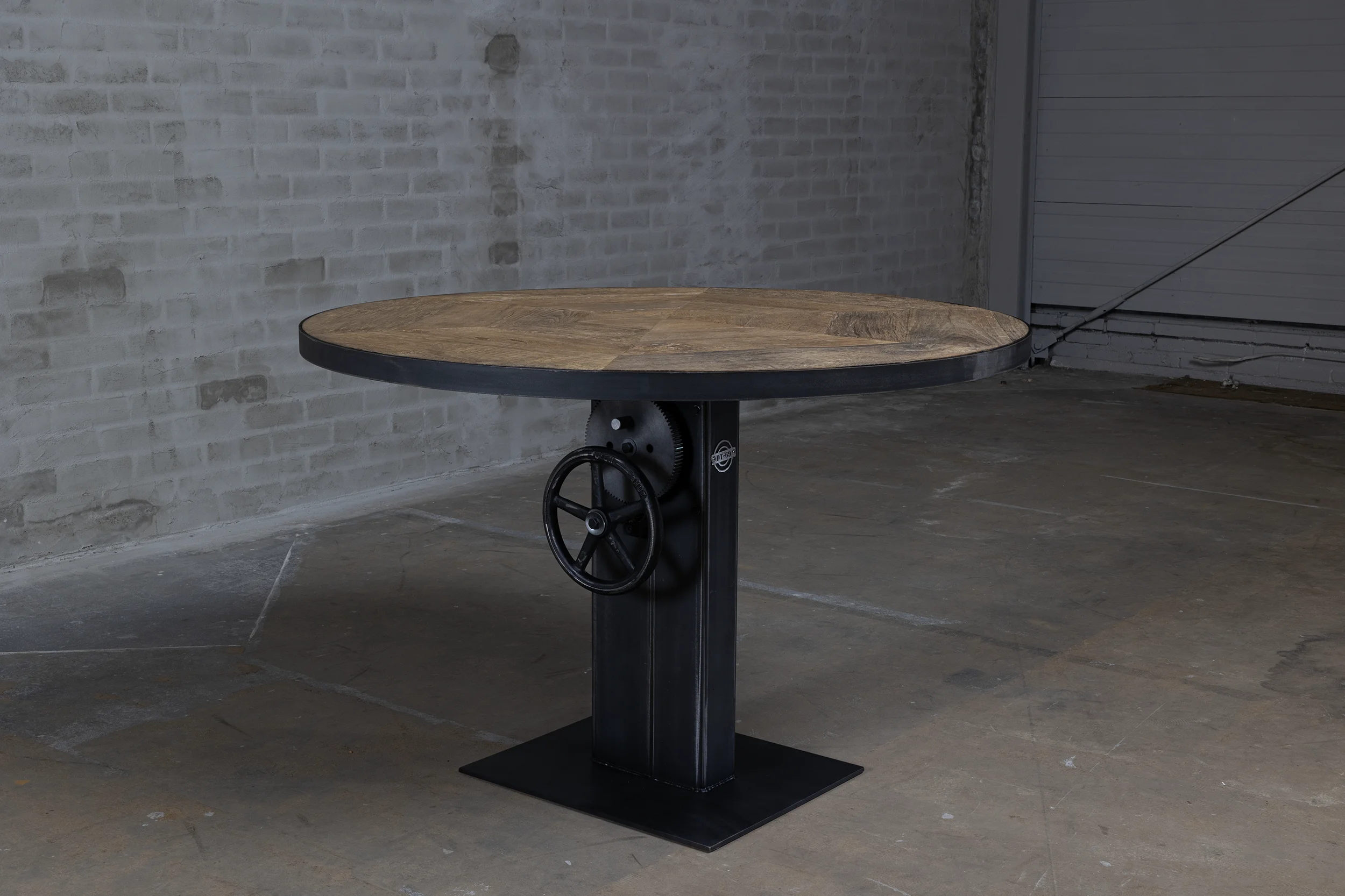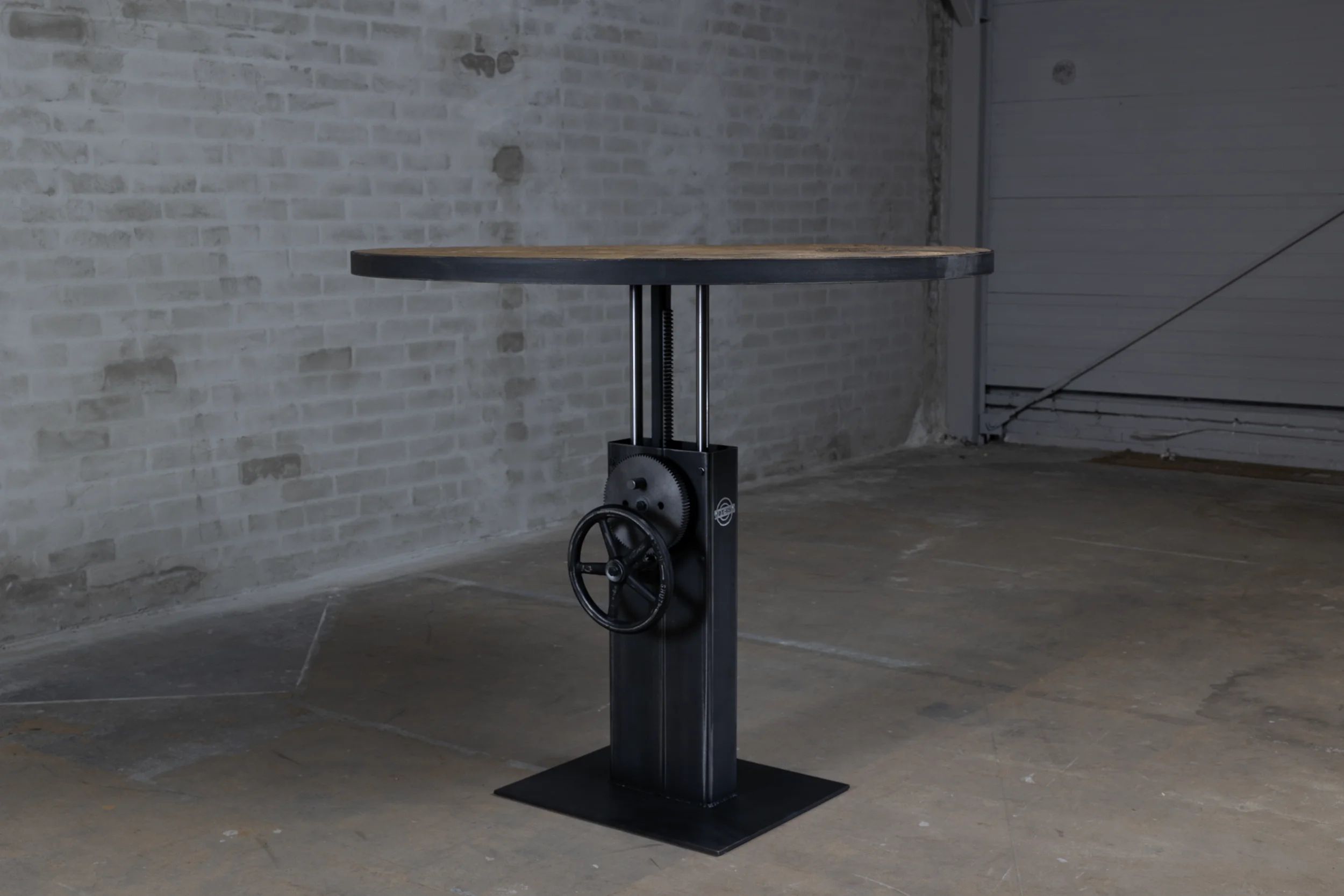 Deze industriële bistrotafel beschikt over een hoogte verstelbaar stalen onderstel dat in eigen werkplaats op maat wordt gemaakt. De tafel is verstelbaar van 76cm tot ongeveer 114cm hoogte, waardoor hij zowel als kleine eettafel (laag) als bartafel (hoog) kan worden gebruikt.