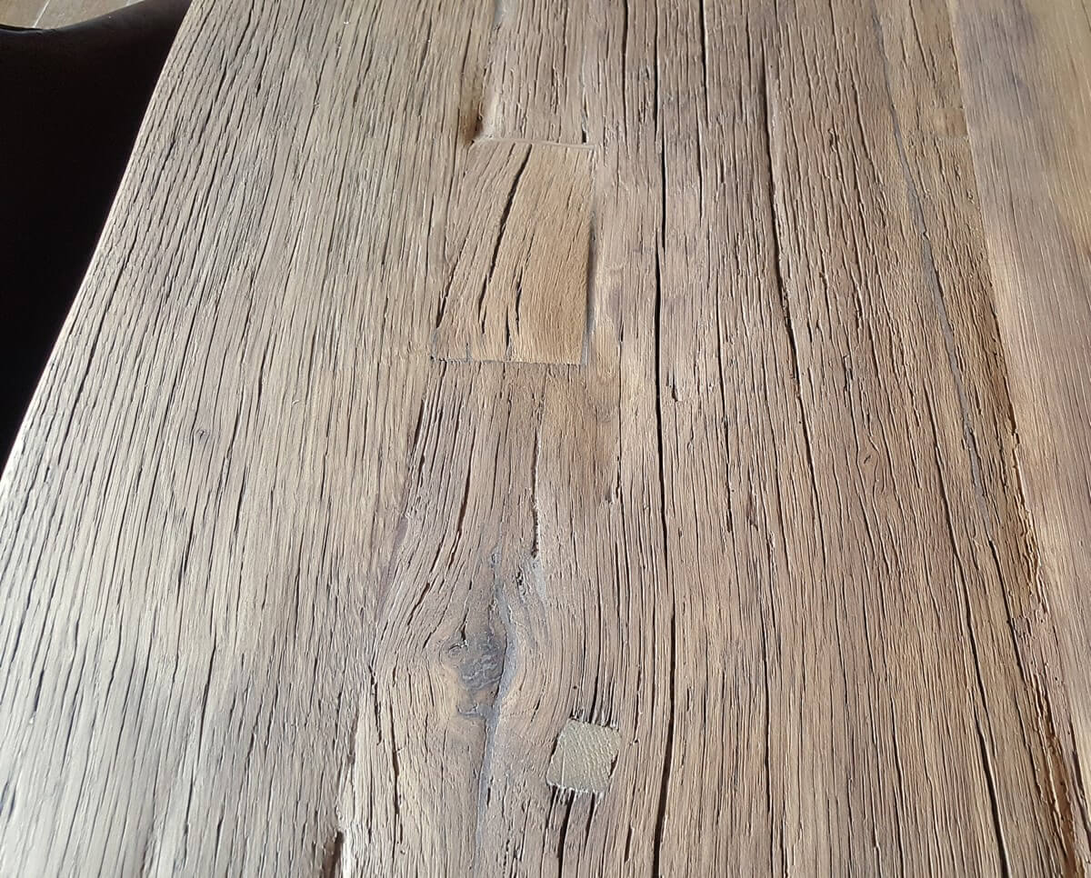 Het zonverweerde eiken is constructiehout. Daar waar o.a. oude verbindingen hebben gezeten zitten gaten in de planken. Deze gaten worden opgevuld met houten blokjes van hetzelfde zonverweerde eiken. Zie de detail foto bij de afbeeldingen. De afmetingen van de voorbeeld tafel op de foto zijn: Ø 150.