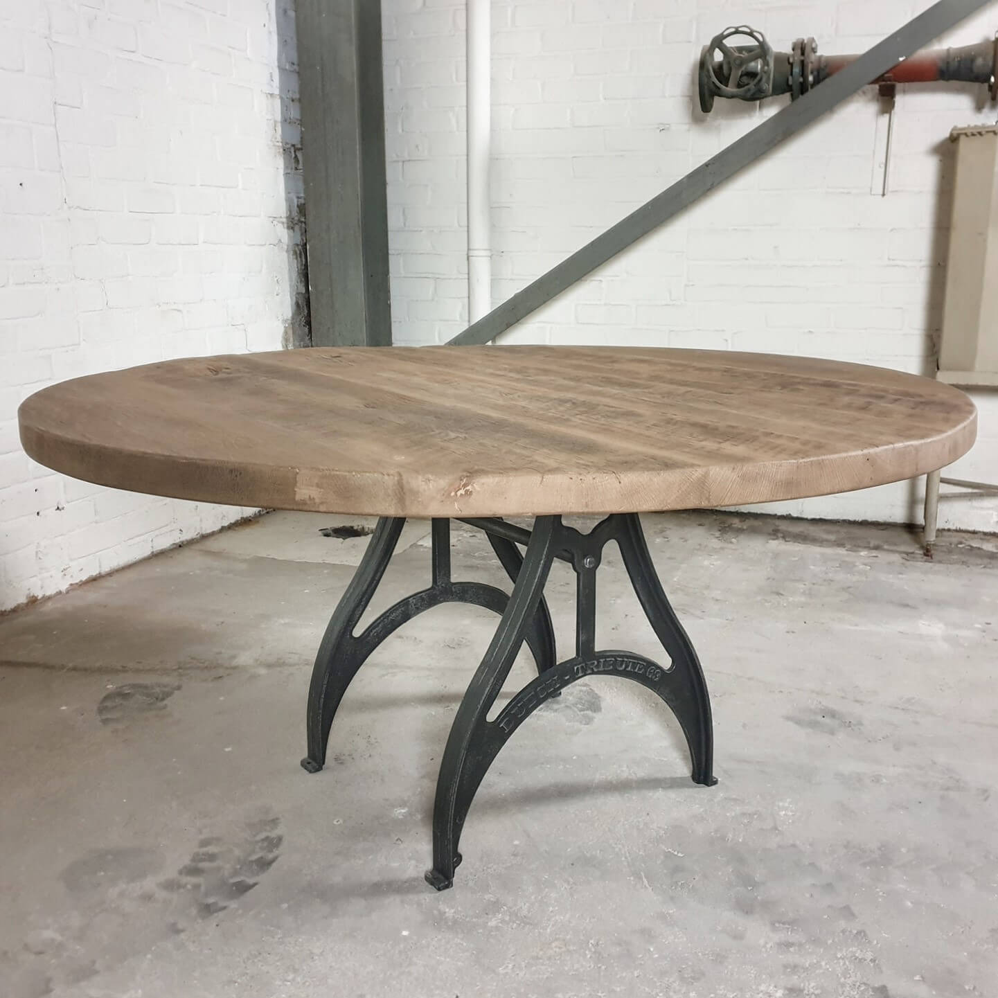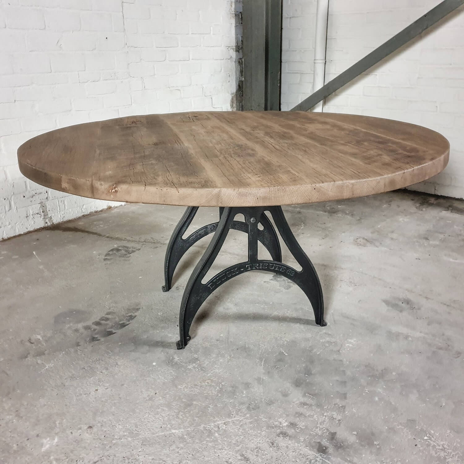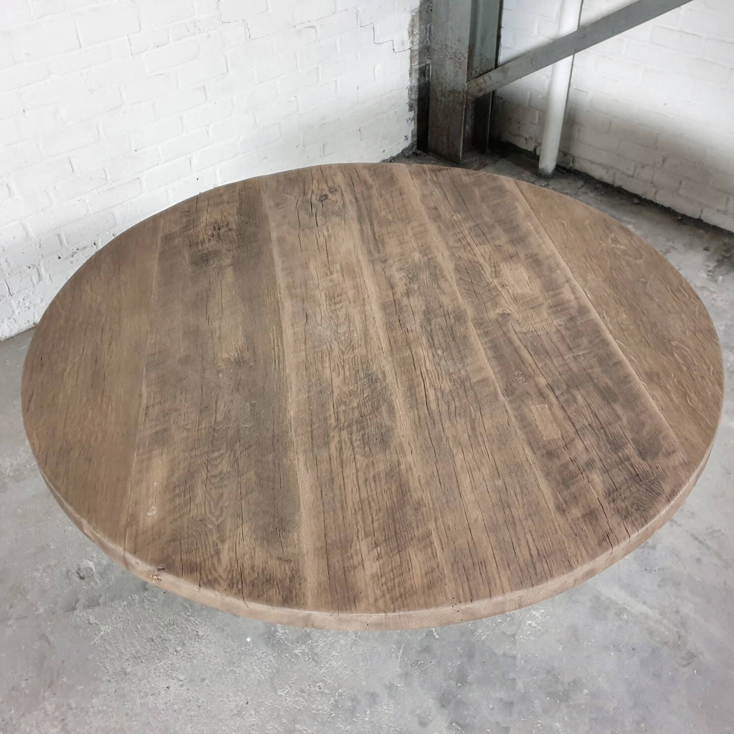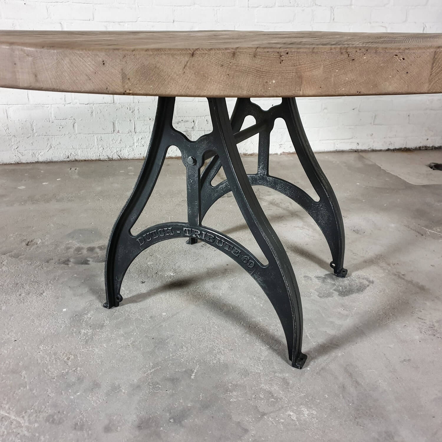 Deze ronde industriële tafel wordt in eigen werkplaats op maat gemaakt en heeft een gietijzeren onderstel. Het tafelblad wordt gemaakt van massief zonverbrand oud eikenhout van 5cm dik. Doordat het eikenhout tientallen jaren lang als gevelbekleding in de zon verkleurd is heeft het een prachtige patine gekregen.