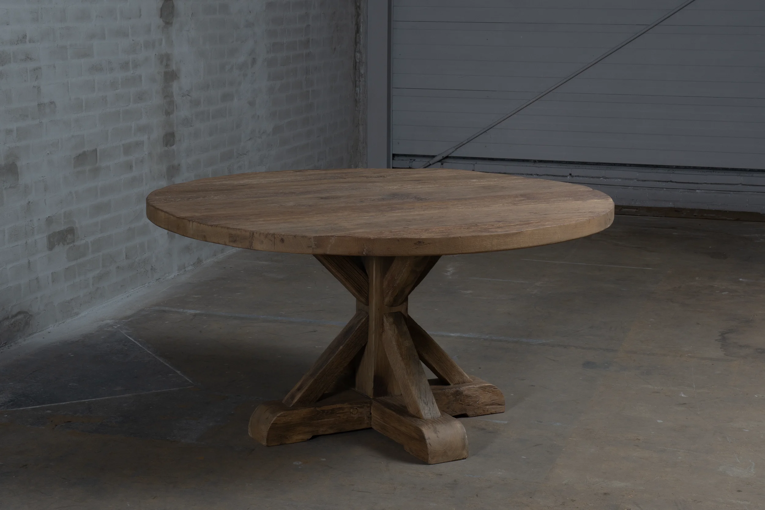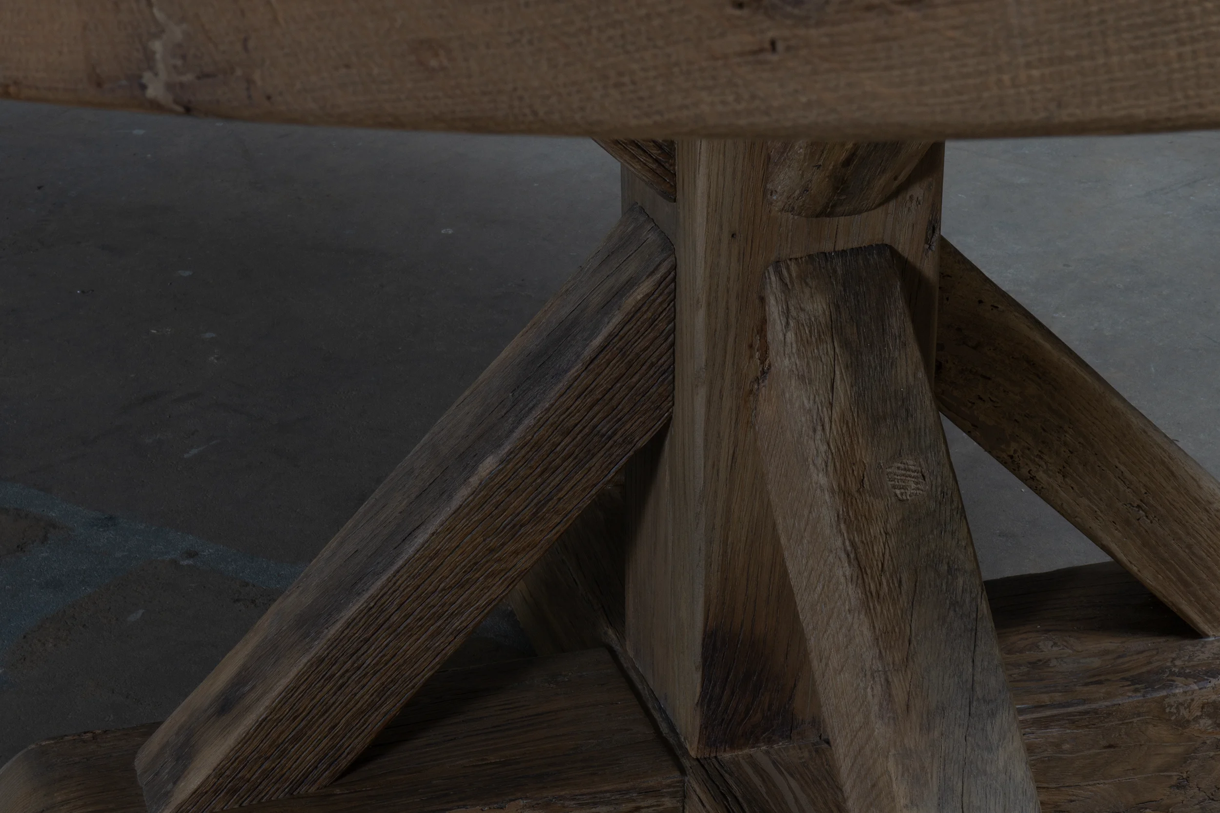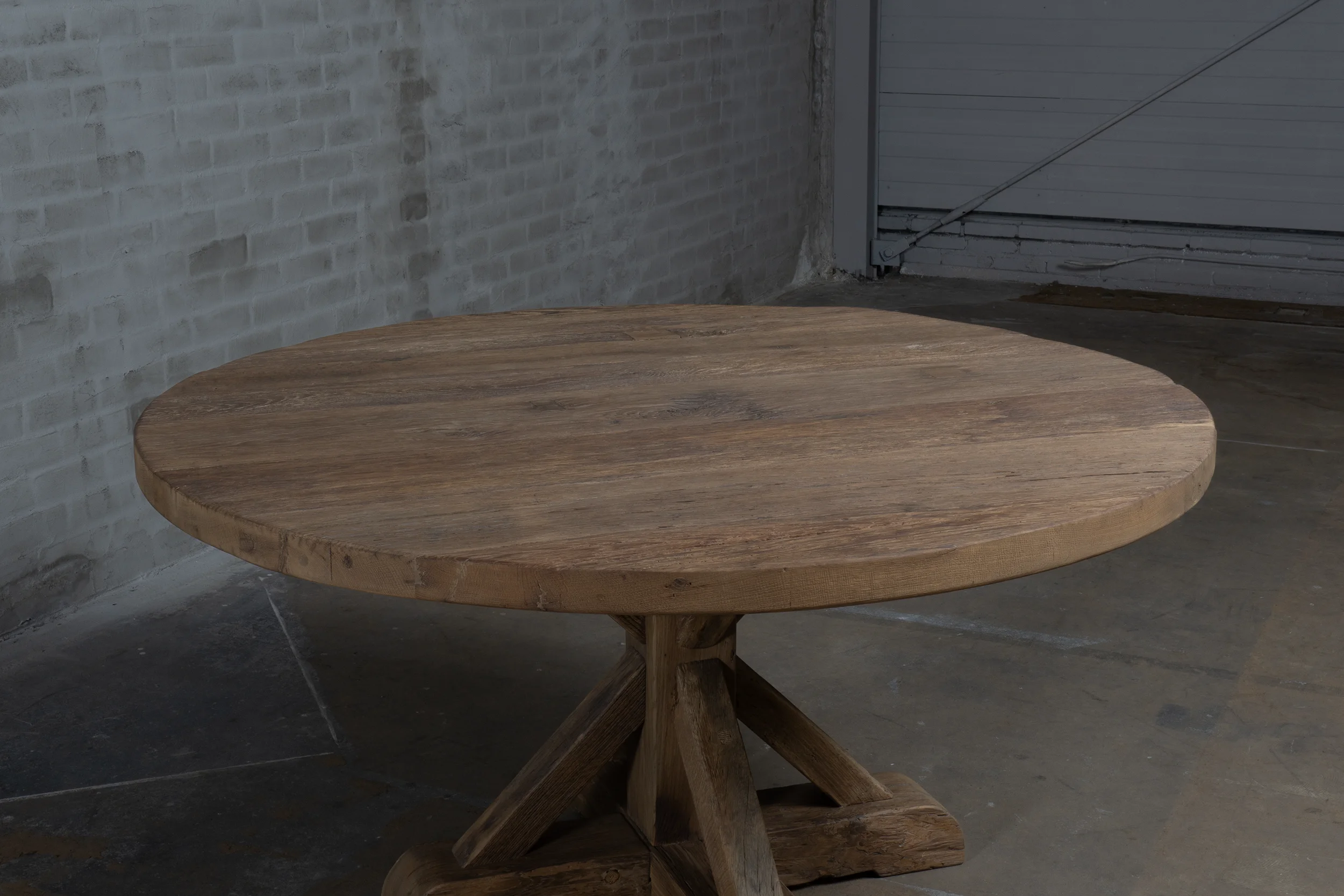 Het tafelblad ca. 5,5cm dik is gemaakt van massief oud eikenhout. Doordat het eikenhout tientallen jaren lang als gevelbekleding in de zon verkleurd is heeft het een prachtige patine gekregen.