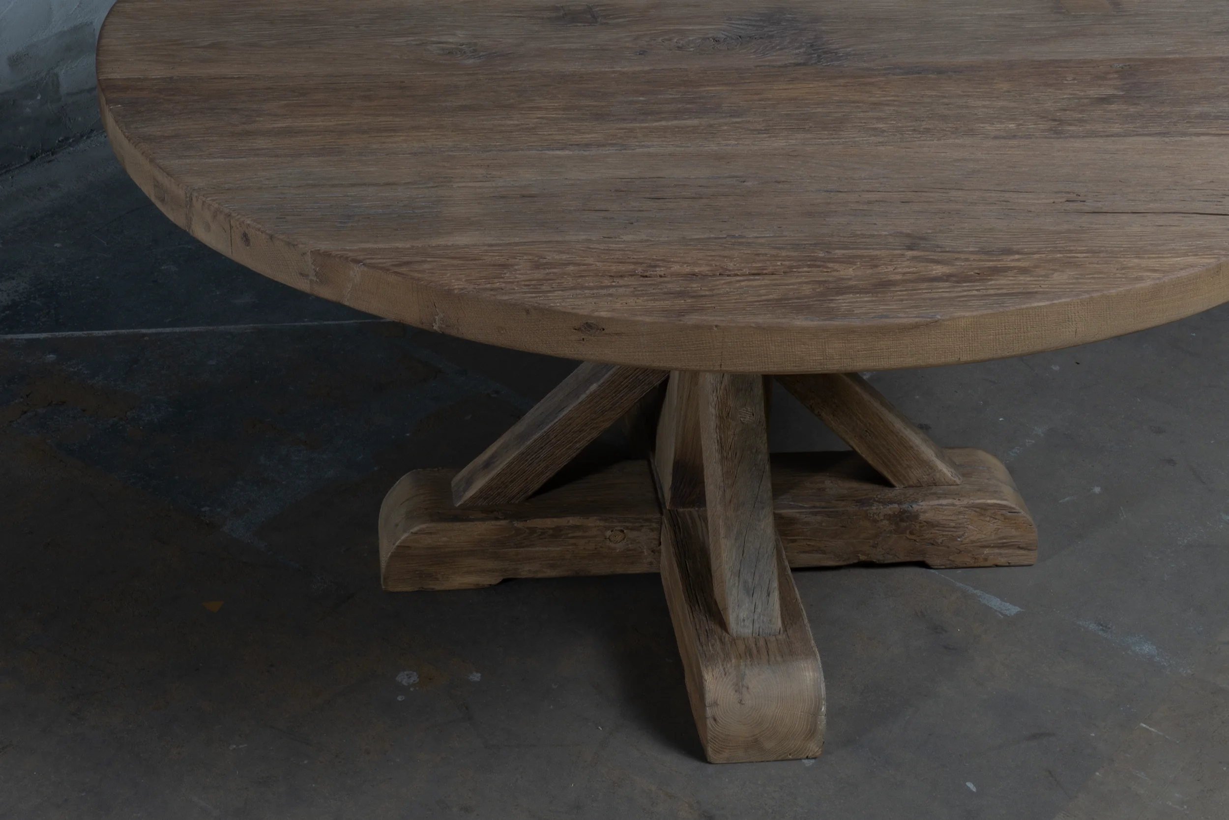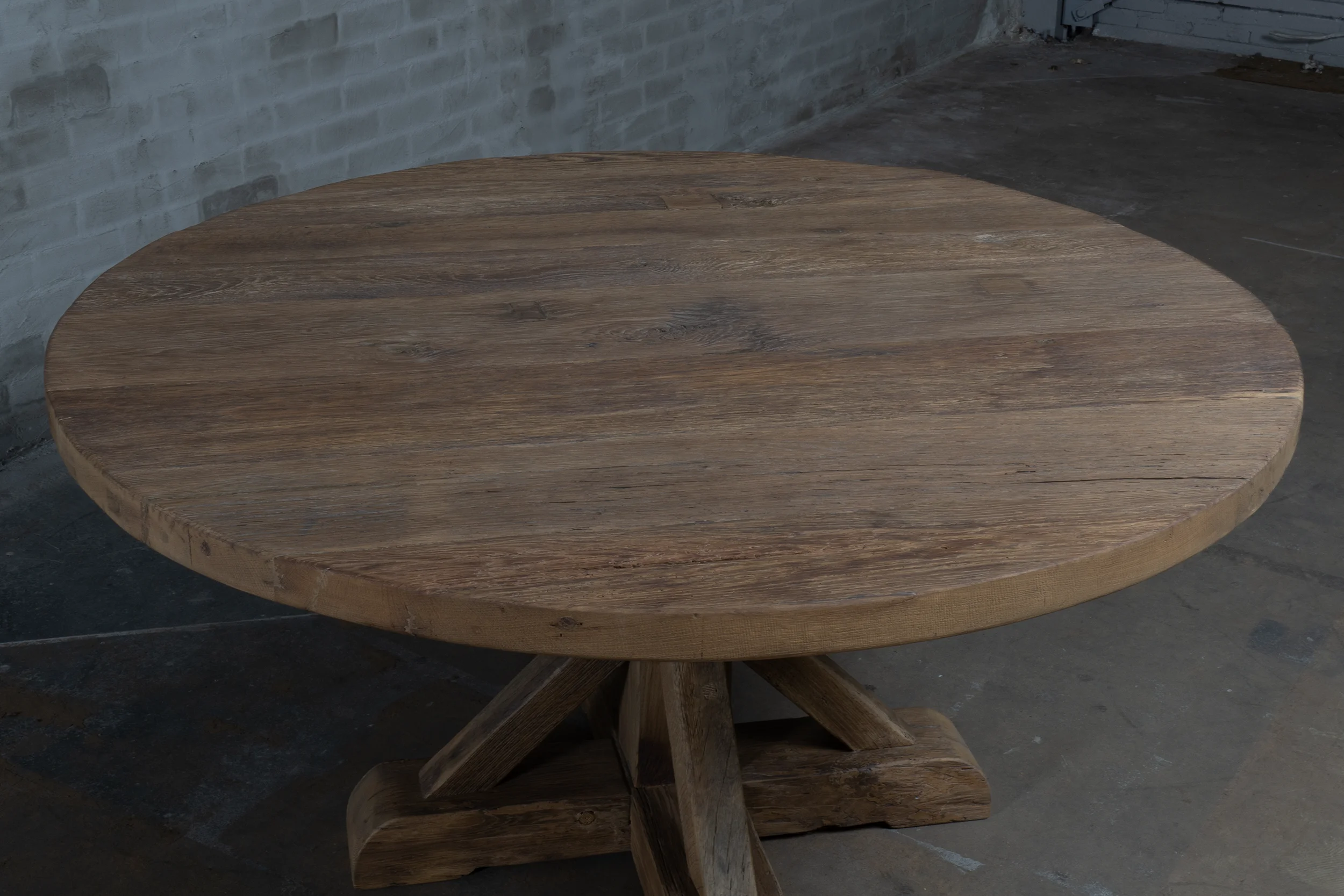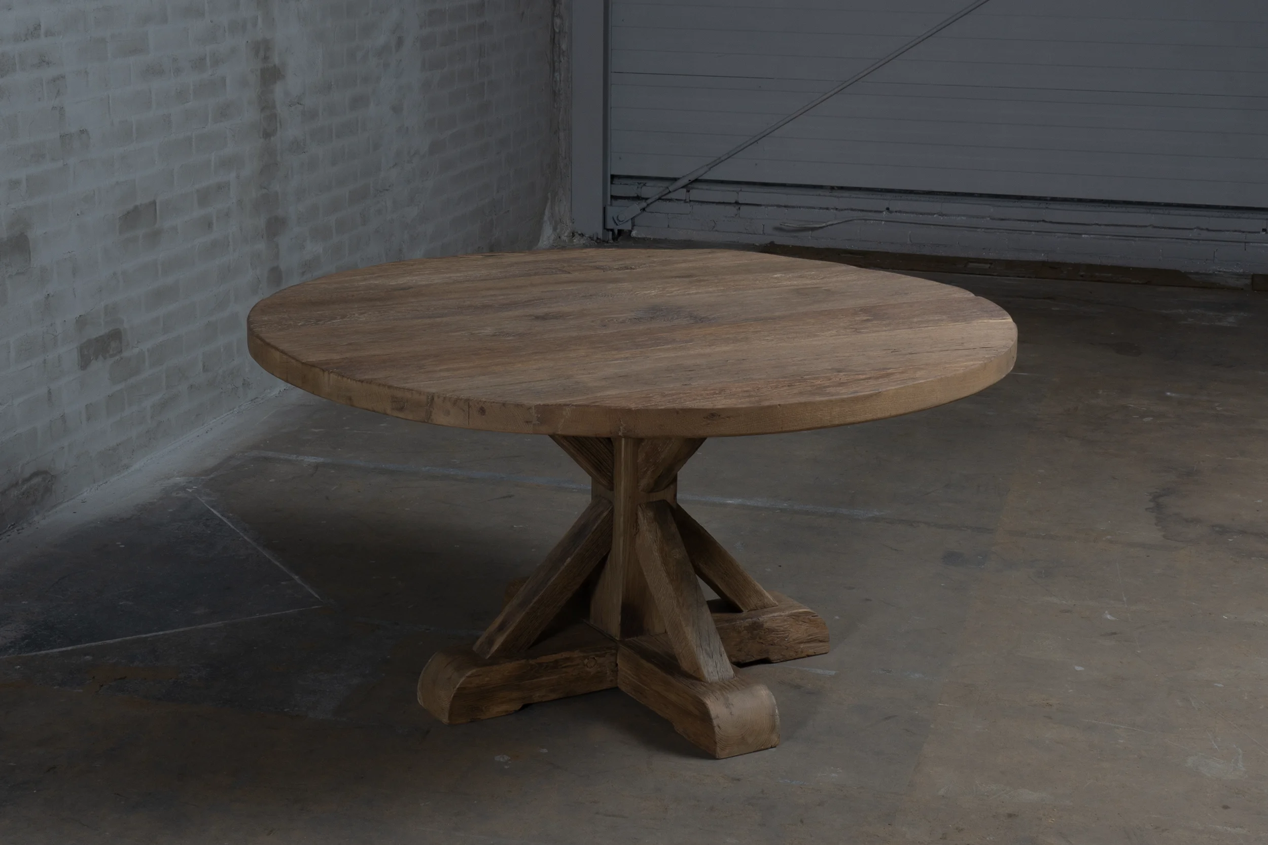 Het tafelblad ca. 5,5cm dik is gemaakt van massief oud eikenhout. Doordat het eikenhout tientallen jaren lang als gevelbekleding in de zon verkleurd is heeft het een prachtige patine gekregen.