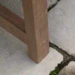 De T22 houten tuintafel is een kloostertafel voor buiten, en wordt op ambachtelijke wijze gemaakt in eigen werkplaats. Het tafelblad is gemaakt van 6cm dikke massief Frakéhouten planken. De sleuven over de lengte van het tafelblad zorgen voor afwatering.