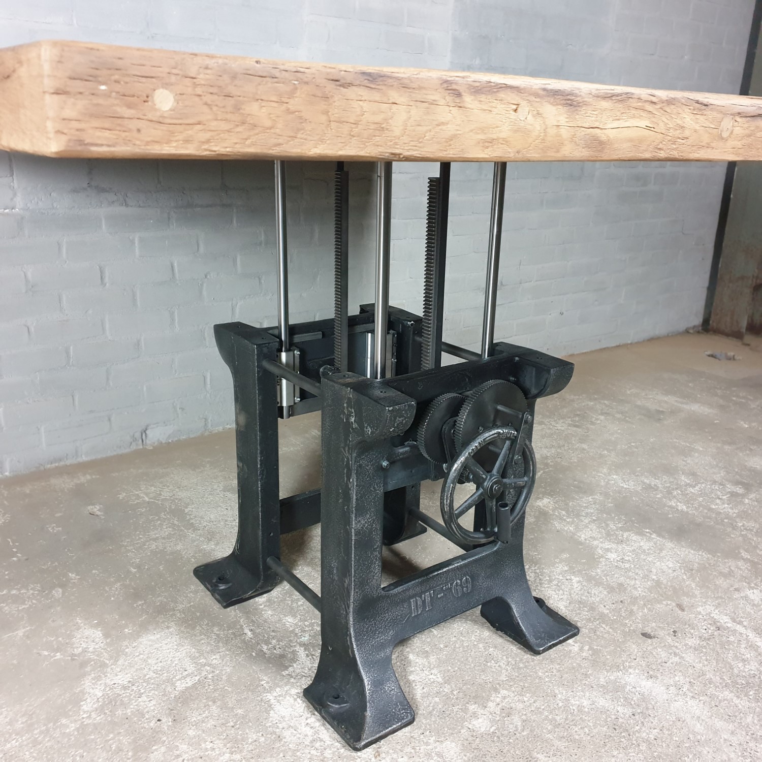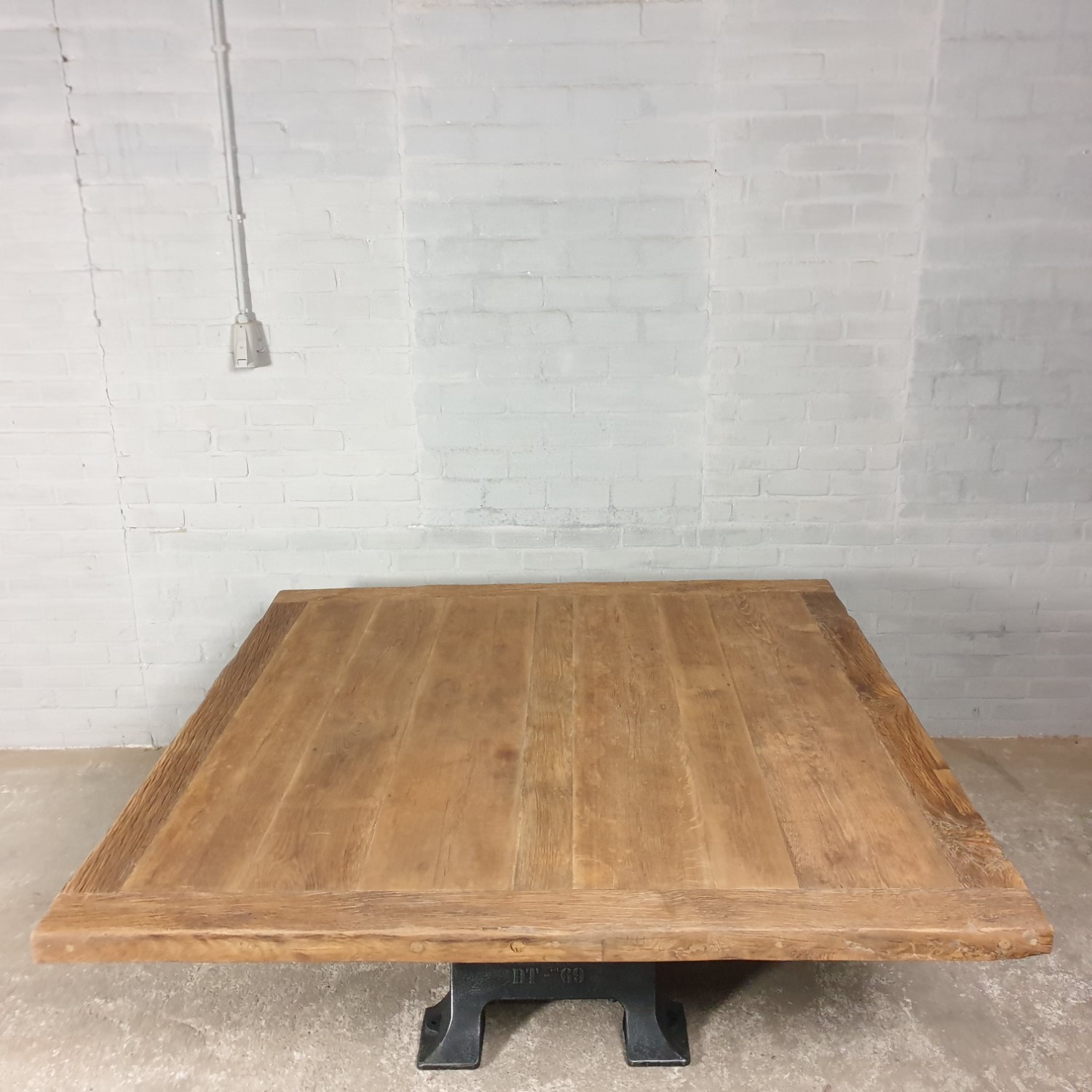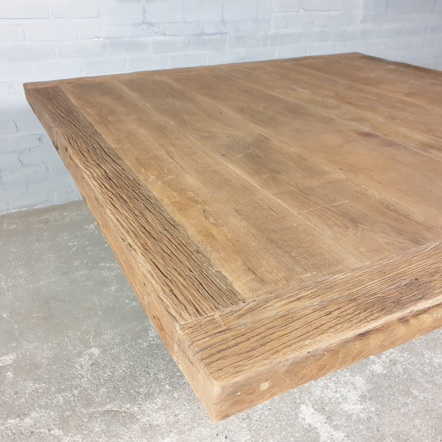 Het tafelblad ca. 7cm dik is gemaakt van dun zonverbrand oud eiken (gezaagd uit de buitenkant van oude balken) dat is belijmd op meubelplaat. De buitenste randen zijn gemaakt van massieve planken. Doordat het eikenhout tientallen jaren lang als gevelbekleding in de zon verkleurd is heeft het een prachtige patine gekregen.