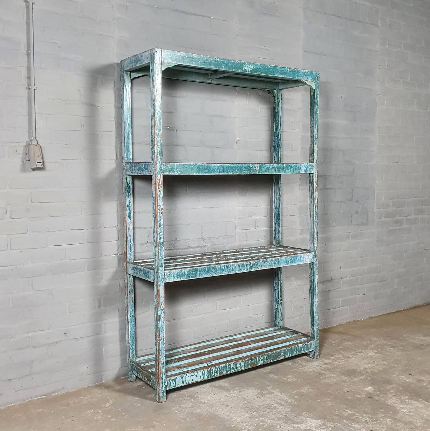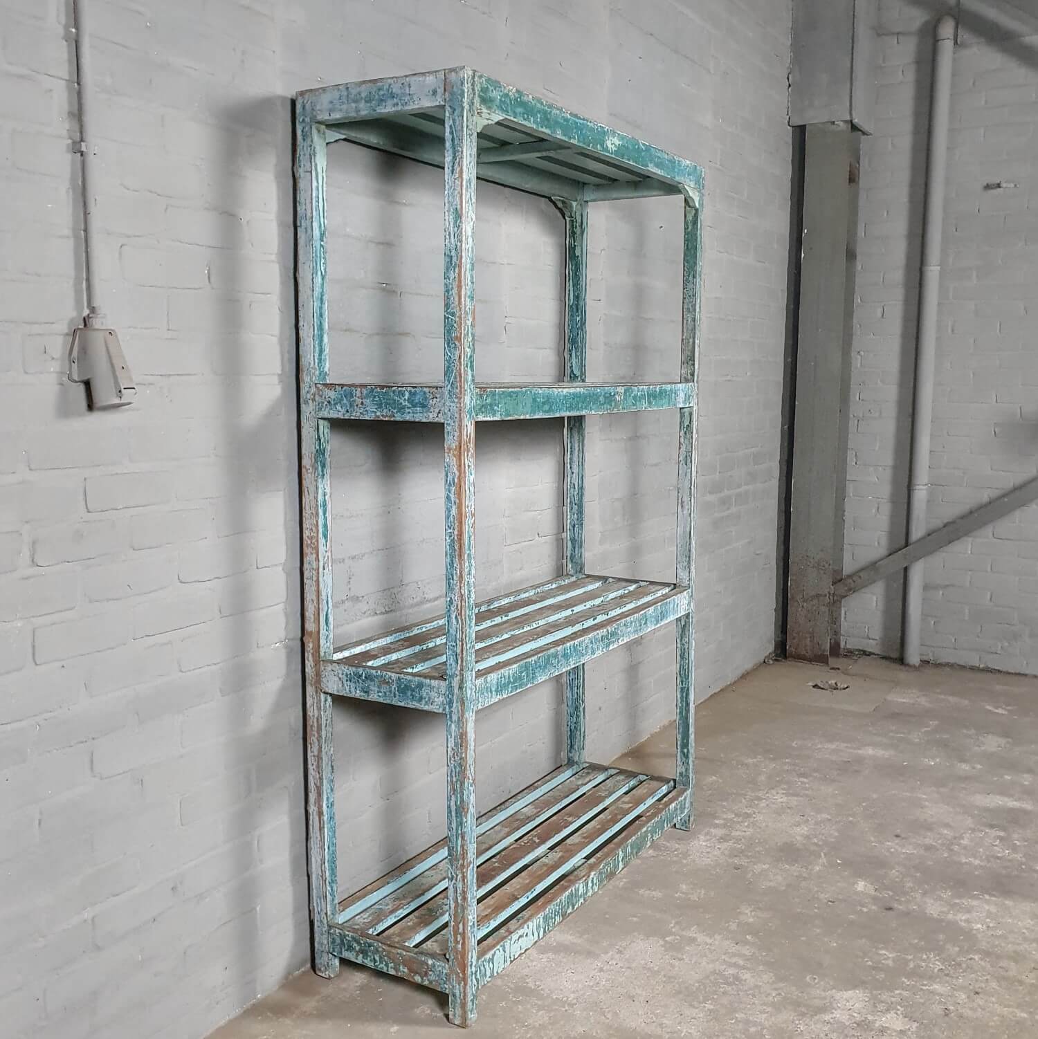 Vintage opbergrek van oud hout. Op het oude hout is een fraaie blauwe patina aangebracht.